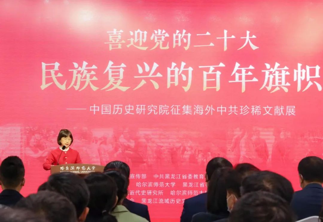 为深入推进党史学习教育常态化长效化,以实际行动迎接党的二十大胜利召开,10月12日,“喜迎党的二十大 民族复兴的百年旗帜——中国历史研究院征集海外中共珍稀文献展”以线上线下相结合的方式在我校美术馆开幕。本次活动由中共黑龙江省委宣传部、黑龙江省委教育工委指导,中国历史研究院、拼搏在线登录、黑龙江省社会科学界联合会主办,中国社会科学院近代史研究所、拼搏在线登录历史文化学院、黑龙江省历史学会、黑龙江流域历史文化学术交流基地、黑龙江省红色文化研究中心联合承办。校党委书记孙立军,党委副书记李庆霞,党委常委、人事处处长李世彬出席开幕式。中国历史研究院近代史所副所长金以林,黑龙江省委宣传部副部长郝文斌,黑龙江省社会科学界联合会党组书记、副主席刘德权,黑龙江省社会科学界联合会副主席、党组成员王宏宇,黑龙江省档案馆二级巡视员刘伟,黑龙江省历史学会会长李凤飞,中央党史和文献研究院第二研究部周恩来研究处副处长邵建斌等受邀参加开幕式。李庆霞主持开幕式。