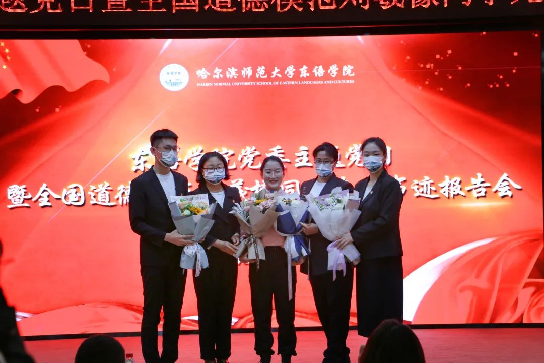 在聆听了刘羲檬同学感人至深的先进事迹后,学院师生代表东语学院党委副书记李晓杰、朝鲜语系主任李楠、2021届学生会主席王畅、2022届学生会主席陈新奥纷纷上台,为刘羲檬同学送上鲜花与祝福,一捧捧鲜花中饱含了东语学院对刘羲檬同学的敬意与美好祝愿。