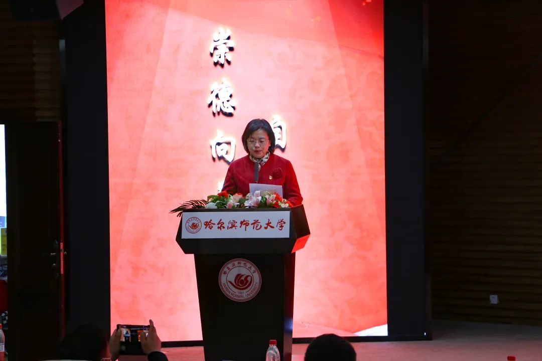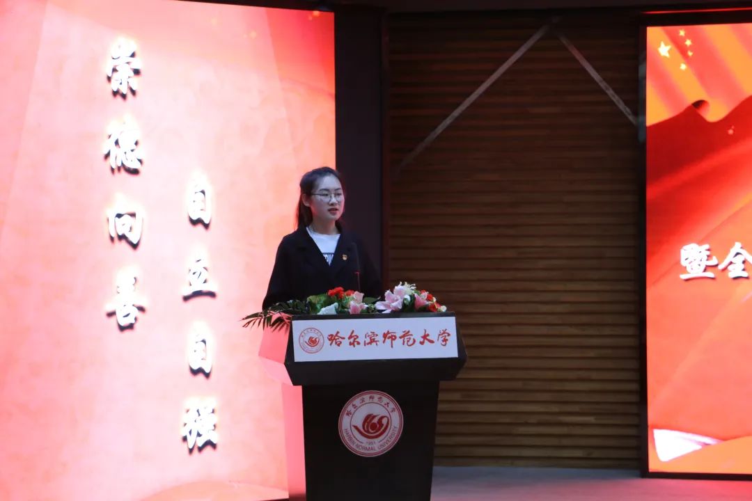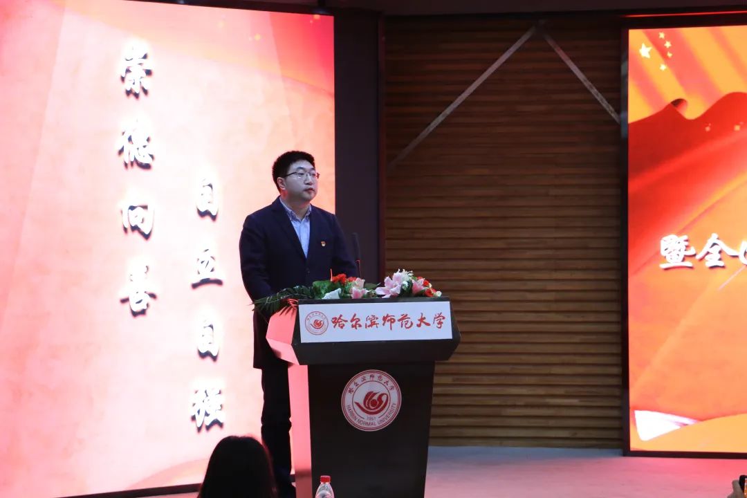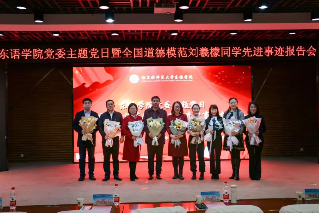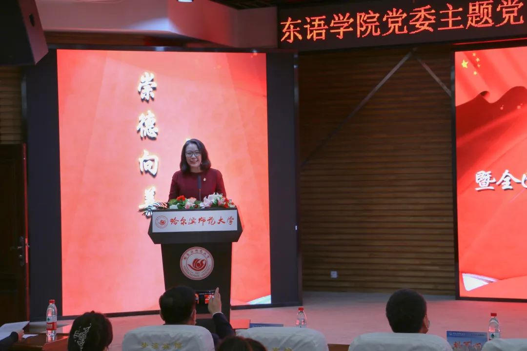为深入学习宣传贯彻党的二十大精神和习近平总书记关于思想道德建设的重要论述精神,贯彻落实黑龙江省委教育工委在全省教育系统开展向刘羲檬同学学习的号召和校党委书记孙立军在10月14日学校基层党委书记例会上对在全校范围内开展好向刘羲檬同学学习的明确要求,更好地发挥道德模范示范引领作用,切实通过身边榜样教育广大师生,11月16日下午,东语学院党委主题党日暨全国道德模范刘羲檬同学先进事迹报告会在梦溪宾馆二楼报告厅召开。校党委副书记、工会主席郭砾出席报告会并讲话,学校党委组织部、宣传部、学生工作部(学生处、武装部)、学校团委负责同志出席报告会,东语学院全体师生以线上线下相结合方式参加报告会。报告会由东语学院党委书记包志伟主持。