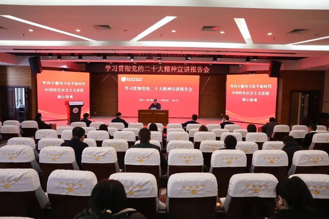 孙立军以《学习贯彻党的二十大精神,全面推进学校高质量发展》为题,从“深刻领会党的二十大的主题”“深刻领会过去五年的工作和新时代十年的伟大变革”“深刻领会开辟马克思主义中国化时代化新境界”“深刻领会新时代新征程中国共产党的使命任务”“深刻领会全面建设社会主义现代化国家的目标任务”“深刻领会坚持党的全面领导和全面从严治党的重大部署”“深刻领会团结奋斗的时代要求和对青年与青年工作的高度重视”“切实加强党对学校工作的全面领导,引领支撑学校各项事业高质量发展”等8个方面,对党的二十大精神进行了全方位宣讲。