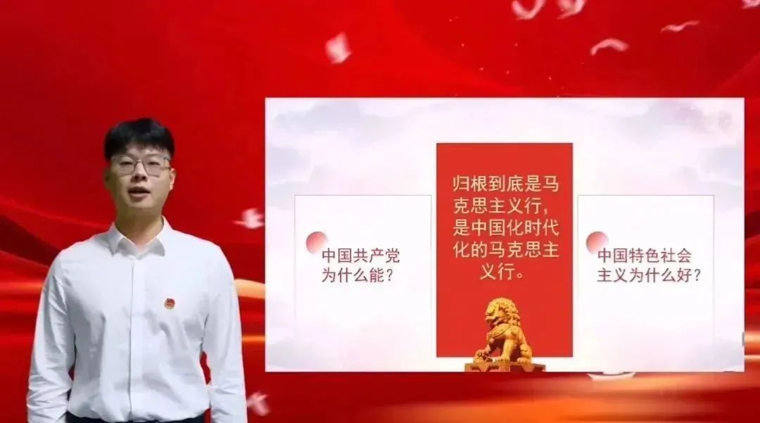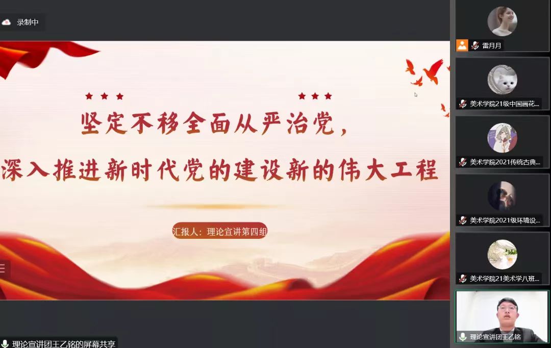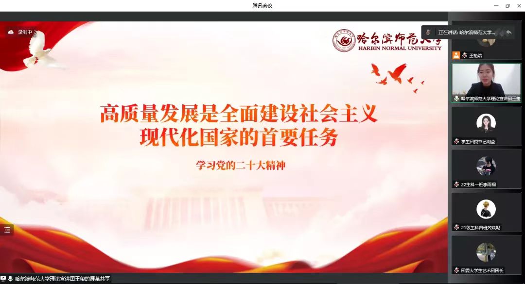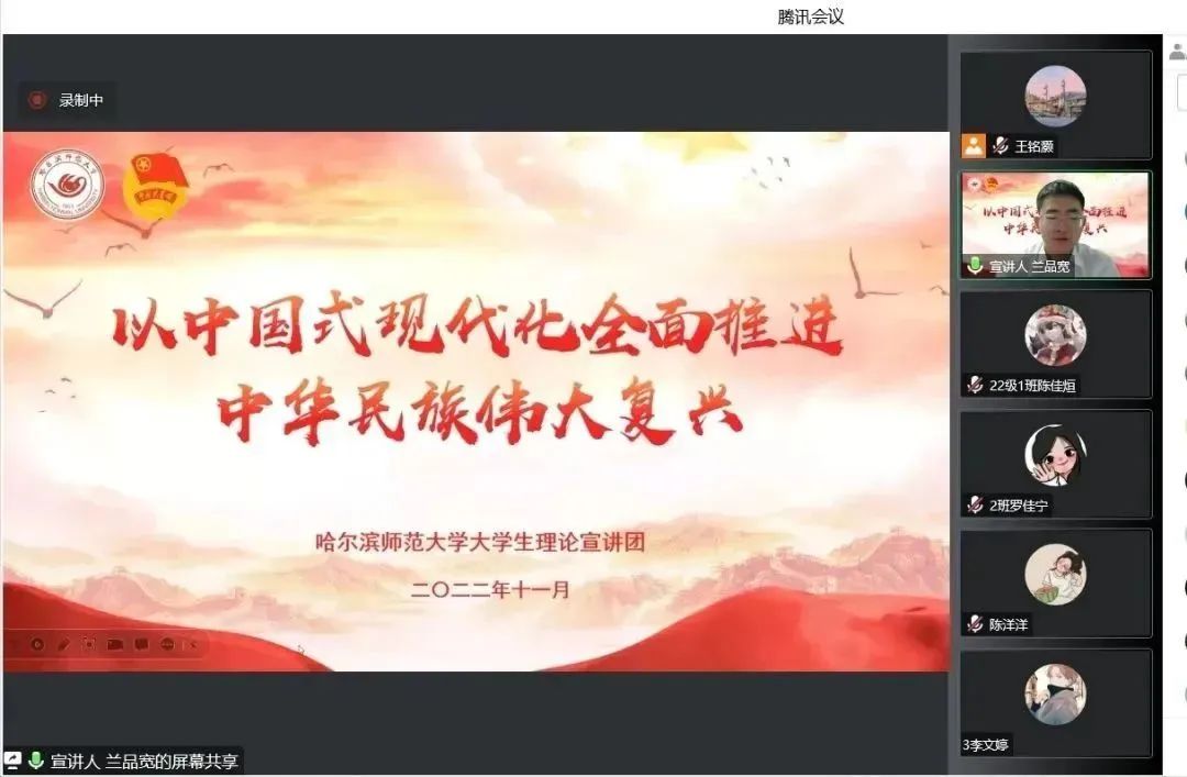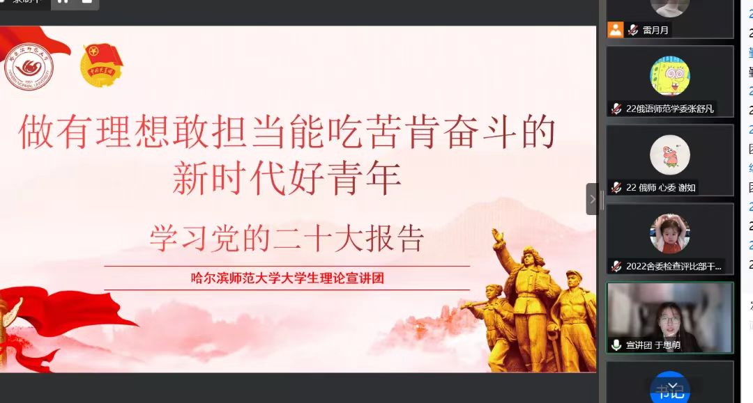 优化形式,主动应变,采用交流互动多、受众覆盖广的宣讲方法。宣讲团依据课程安排设置了“宣讲菜单”,建立青年宣讲工作长效机制,面向基层团组织开展资源推介,形成了“基层‘点餐’预约课程、讲师团‘配餐’、线上‘送课上门’”的预约化宣讲模式。在宣讲工作正式启动后,根据属地疫情防控变化,宣讲团及时调整宣讲方式,启动线上宣讲模式。针对线上宣讲特点,全体讲师优化讲解互动环节、调整讲稿表述方式,各备课小组进行多次线上模拟宣讲演练。在正式宣讲过程中,宣讲团成员们通过对线上平台的熟练使用,最大限度打破人员数量、场地、时间等方面的阻力,实现了不同年级、不同专业受众全覆盖,同时,运用讲故事、谈感受、析案例等互动性强、对话感足的方式方法,把“大道理”转化为青年喜闻乐见的“小故事”,确保宣讲工作有力有序、保质保量,切实引导广大团员青年学思悟践、踔厉奋发。