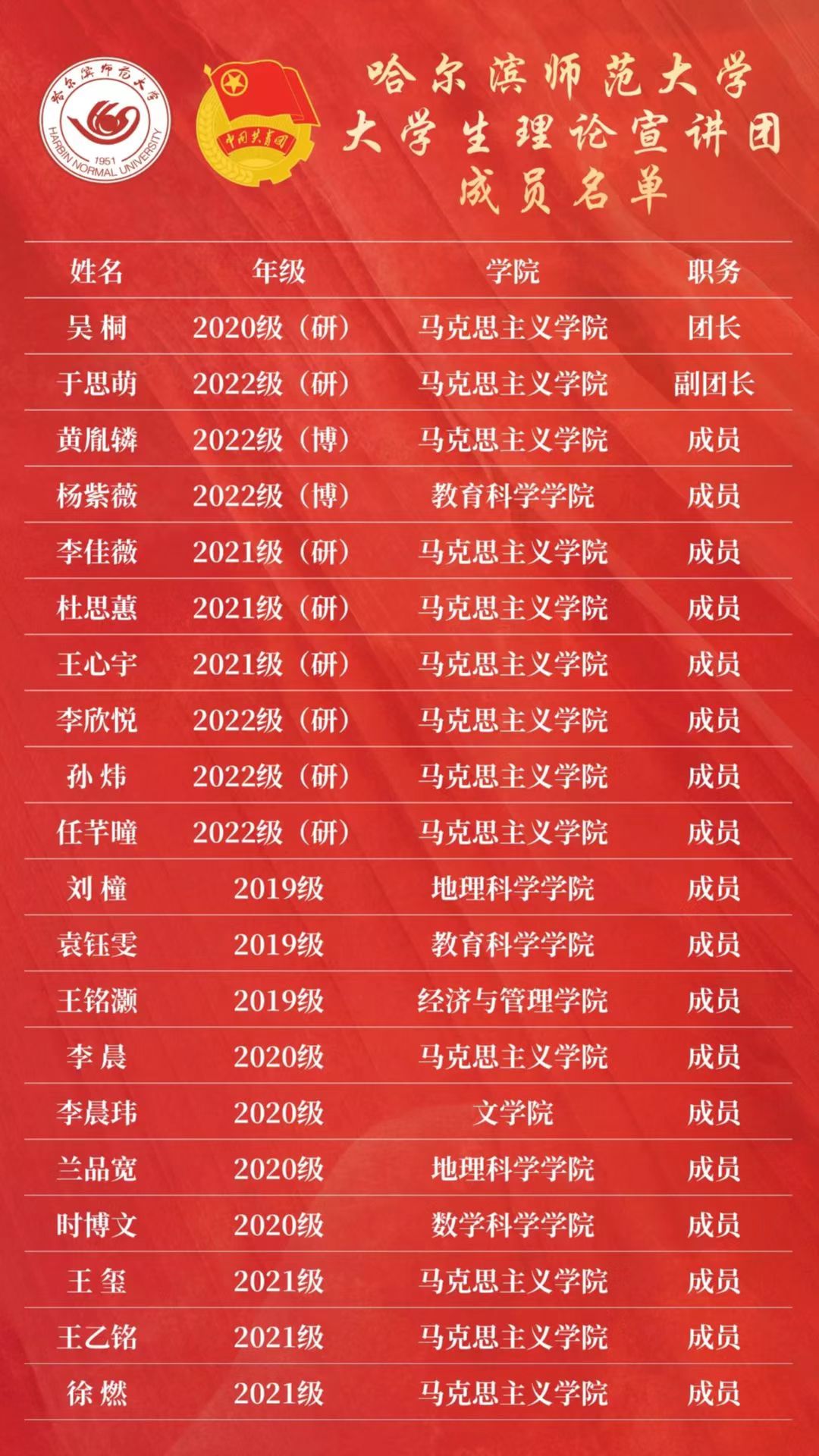 优配队伍,多维联动,组建政治素养高、理论功底强的宣讲团队。理论宣讲的关键是要有一支坚定信仰党的创新理论、系统掌握党的创新理论、生动宣讲党的创新理论的骨干宣讲队伍。通过团员青年自主报名、各级团组织推介,充分依托全国重点马克思主义学院、学校青年马克思主义者培养工程、学生干部能力素质提升培训班,学校大学生理论宣讲团选拔、组建了一支政治素养过硬、理论功底较强、表达能力突出、年龄结构合理的青年宣讲团队。其中,博士研究生2名,硕士研究生8名,本科生10名,马克思主义相关专业学科学生共计13人,多名成员为2022年哈尔滨市民族团结宣讲团成员。