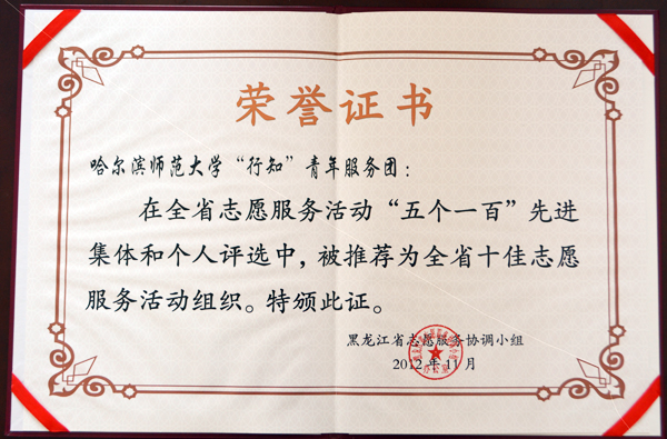 12月5日,为迎接第27个国际志愿者日,全省志愿服务工作座谈会在哈尔滨市花园邨宾馆召开。省委常委、宣传部长张效廉出席会议并讲话。会议对全省志愿服务活动先进集体和个人进行了表彰,我校“行知青年”志愿服务队荣获“2012年度志愿者服务优秀团队”荣誉称号。