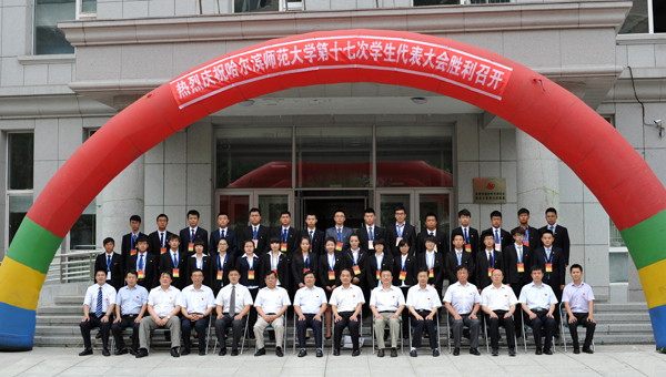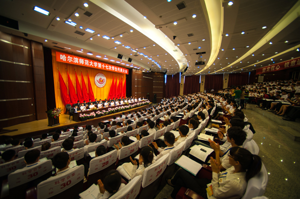 我校第十七次学生代表大会于6月26日在松北校区科学会堂隆重召开。团省委副书记陈凯云,团省委常委、学校部部长关大辉,省学联驻会执行主席张陆琛,我校党委书记、校长王选章等党政领导出席开幕式。哈尔滨工业大学、哈尔滨工程大学、东北林业大学等兄弟院校的团委老师、学生会成员和我校各部处领导,附属中学、艺术学校特邀代表,各学院党委副书记、全体辅导员参加会议。会议由西语学院李美君同学主持。