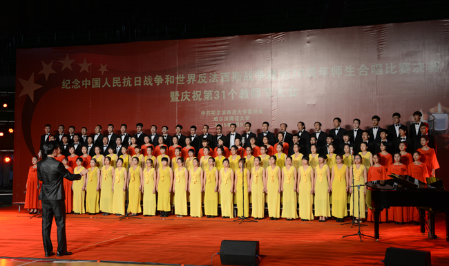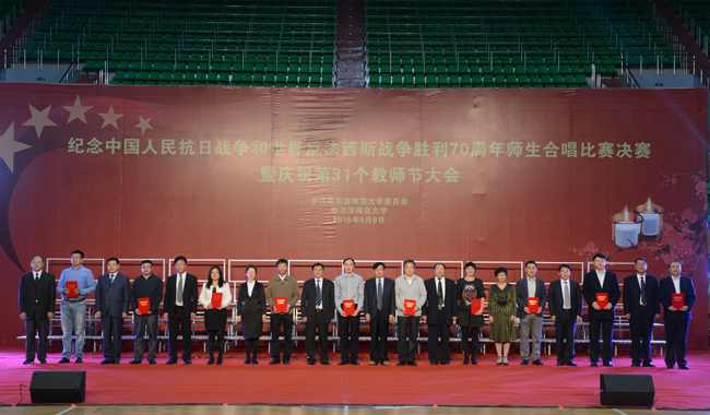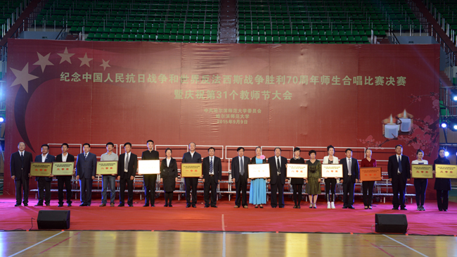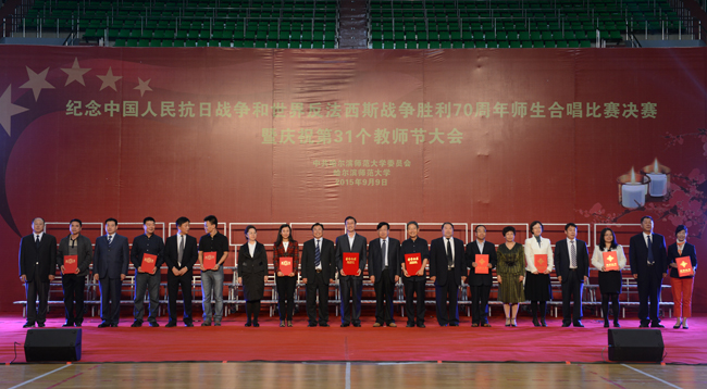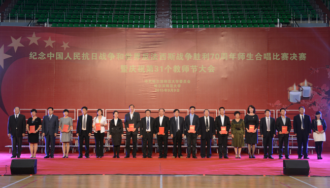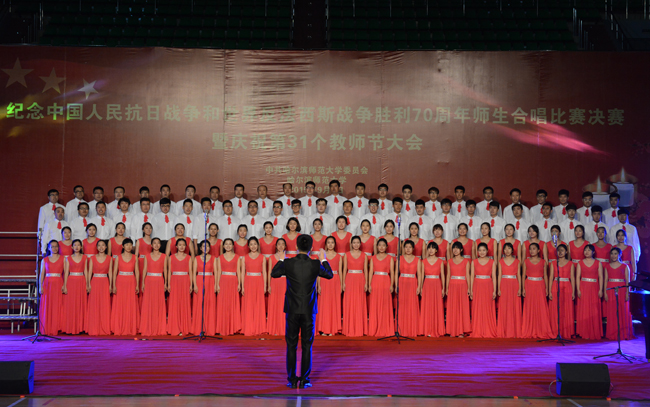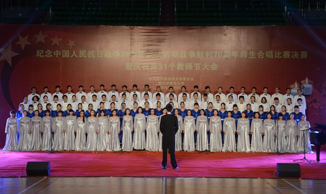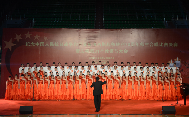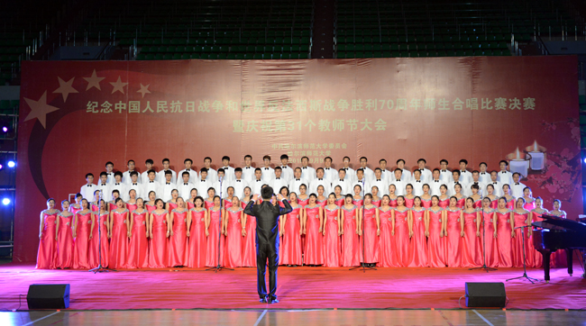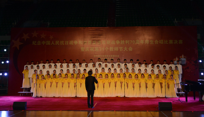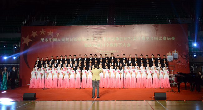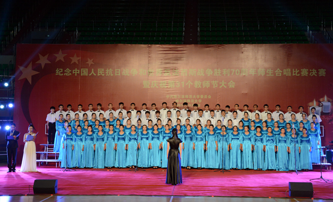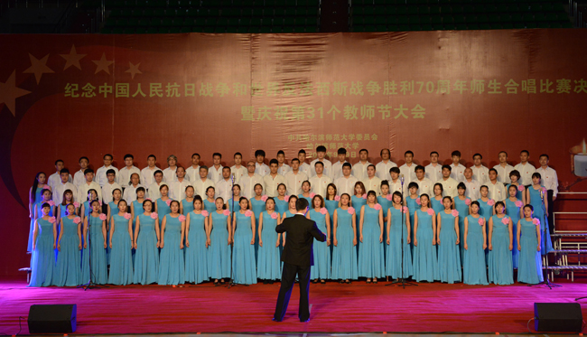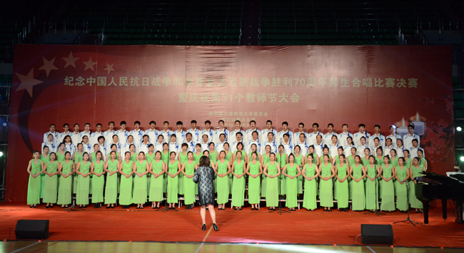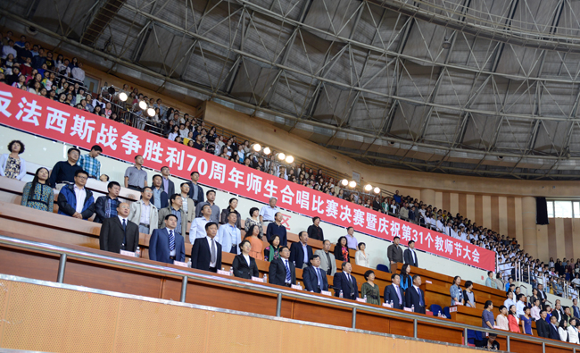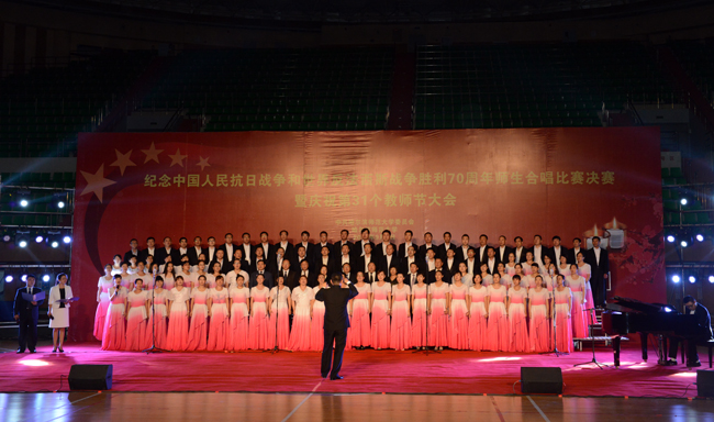 (景岩/文)9月9日下午,我校纪念中国人民抗日战争和世界反法西斯战争胜利70周年师生合唱比赛决赛暨第31个教师节庆祝大会在体育馆隆重举行。党委书记、校长王选章等学校党政领导出席大会。全校副处级以上干部,学院各系主任,博士生导师,各民主党派负责人,江北校区各学院教师代表、在校生代表、新生代表参加大会。大会由校长王选章主持。