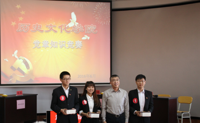 (刘宪辉/文)2016年6月1日,历史文化学院在人文楼516室举行了“学习党章”知识竞赛活动。校党委常委、工会主席赵科学,校党委常委、组织部长刘柏清出席活动并为获奖选手颁奖。历史文化学院150余名教师党员、学生党员观摩了比赛。