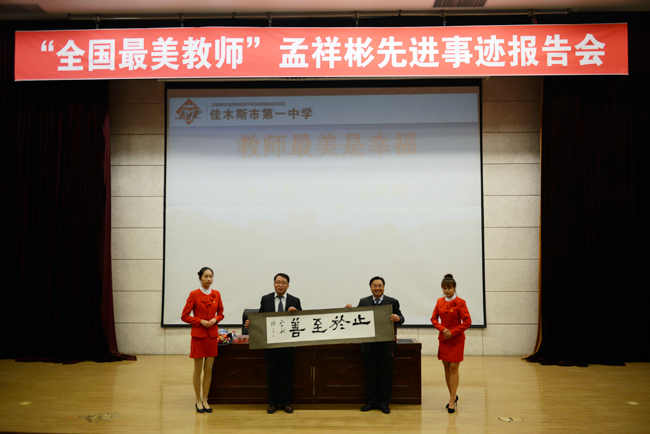 报告会上,党委书记代表学校向孟祥彬老师赠送了由我校历史文化学院教授、著名书法家栾继生老师专为孟祥彬老师手书的一幅作品《止于至善》。学生代表、我校历史文化学院学生彭丽璇向孟祥彬老师敬献鲜花。