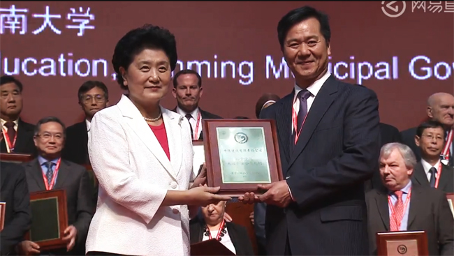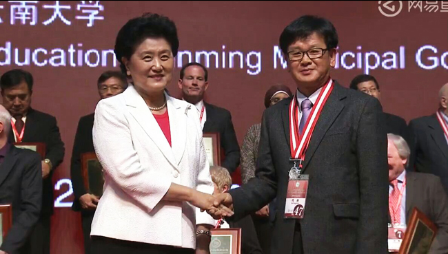 国务院副总理、孔子学院总部理事会主席刘延东出席大会并发表主旨演讲,并为全球孔子学院先进个人和先进单位颁奖。我校因工作成绩突出,被评为孔子学院先进中方合作机构,这是我校首次获此殊荣。校党委书记应邀出席大会,并代表学校接受刘延东副总理颁发荣誉奖牌。