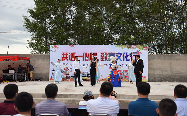 (韩明祥/文)为丰富杜蒙县一心乡百姓文化生活,培养农村群众文化艺术素养,提高农村中小学生综合素质,营造积极健康的农村文化氛围,促进一心乡精神文明建设再上新台阶,我校于7月17日、18日,在杜尔伯特蒙古自治县一心乡举办了主题为“共谱一心情,致富文化行”的“三下乡”社会实践活动。