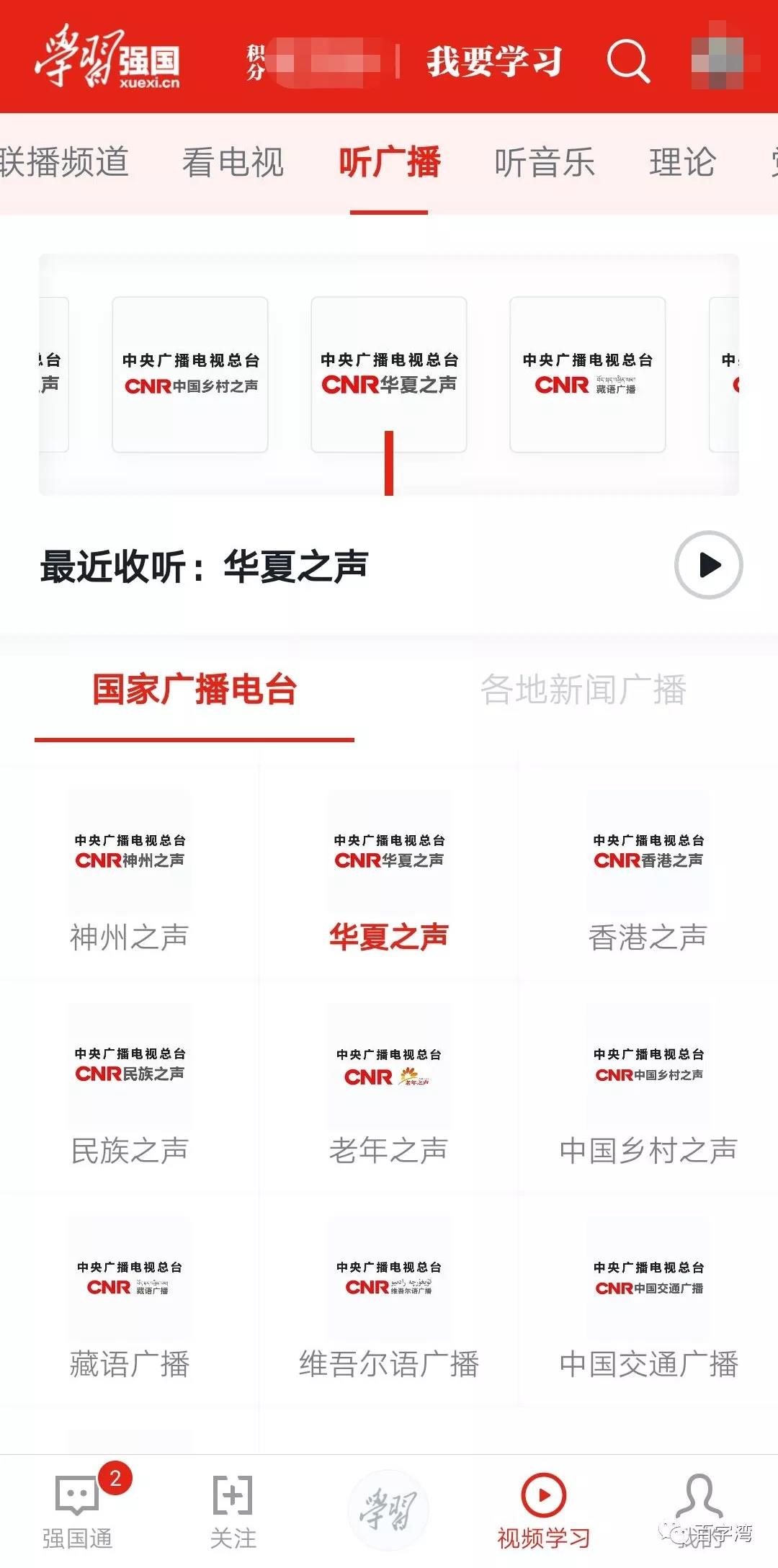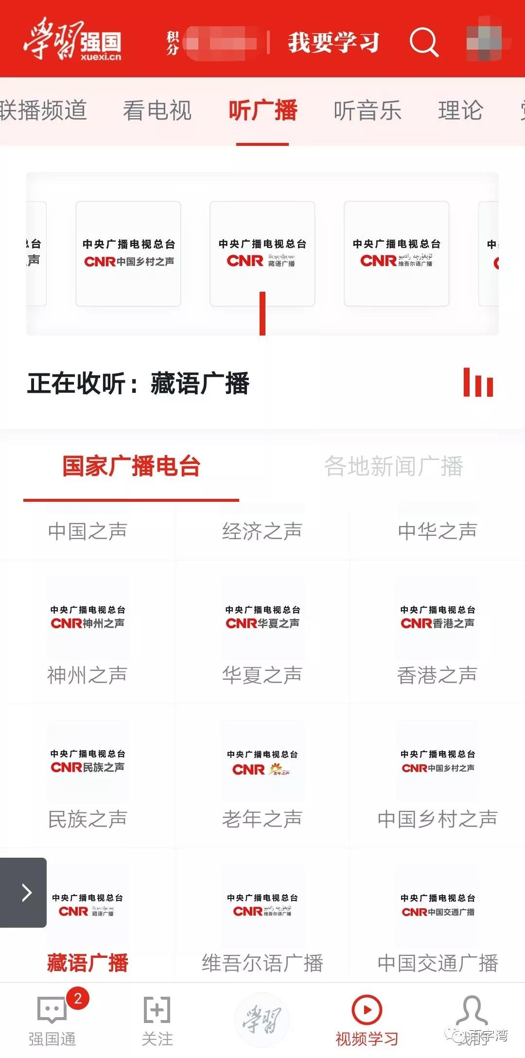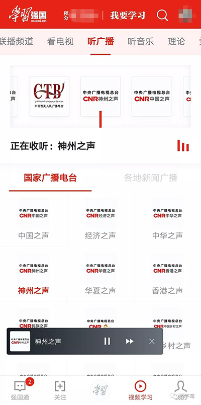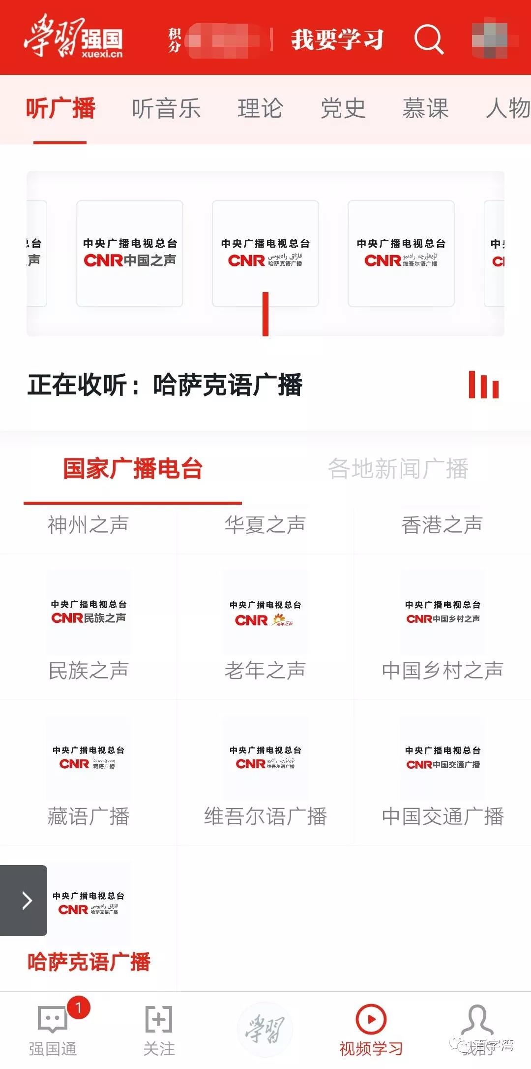 “听广播”是强国APP“视频学习”的第5个频道,紧跟高大上的新闻联播。粗略数了一下,一共收录了国家到地方的数十个广播电台,既包含香港之声,神州之声,华夏之声等面向港澳台同胞的地区广播,也包含了哈沙克语、藏语、维吾尔语等少数民族语广播,天南海北,总有一款适合你。