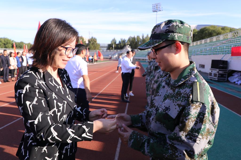 图 校党委副书记郭砾,党委常委、宣传部长姜玉洪为新生代表佩戴校徽