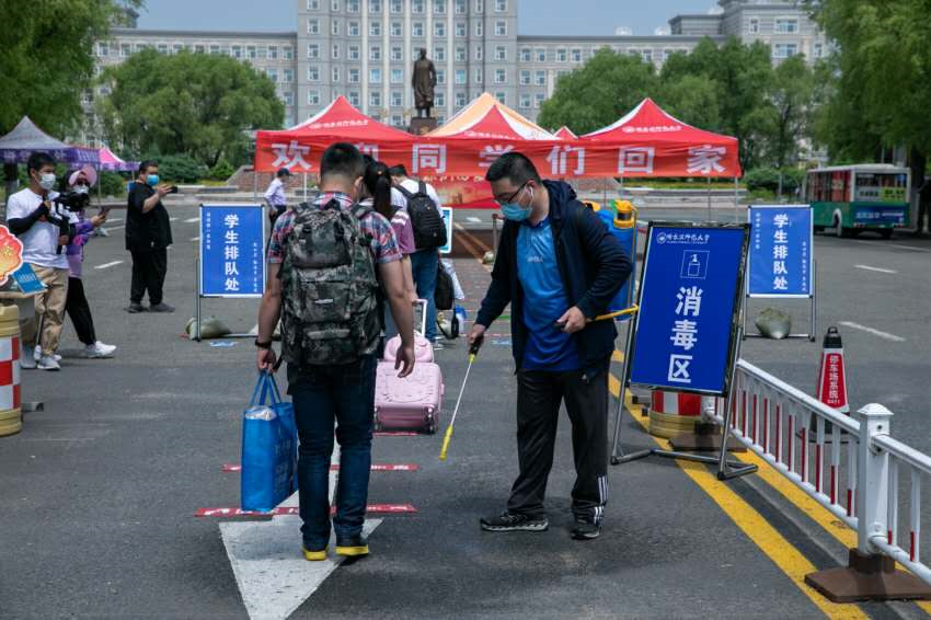 图 工作人员为返校研究生进行卫生消杀工作