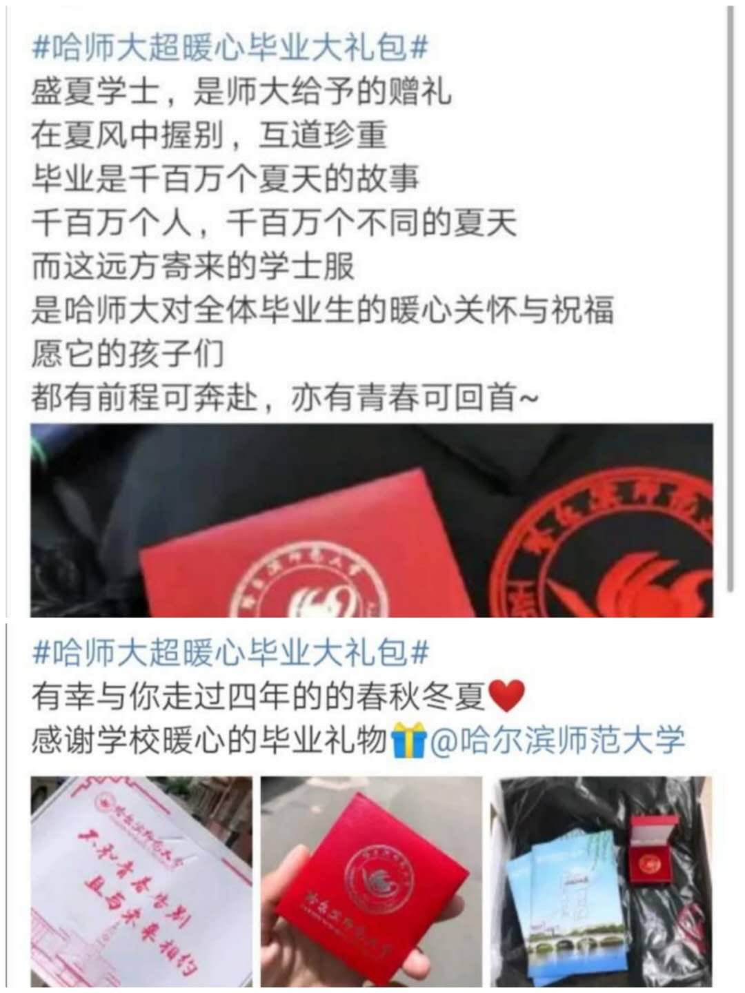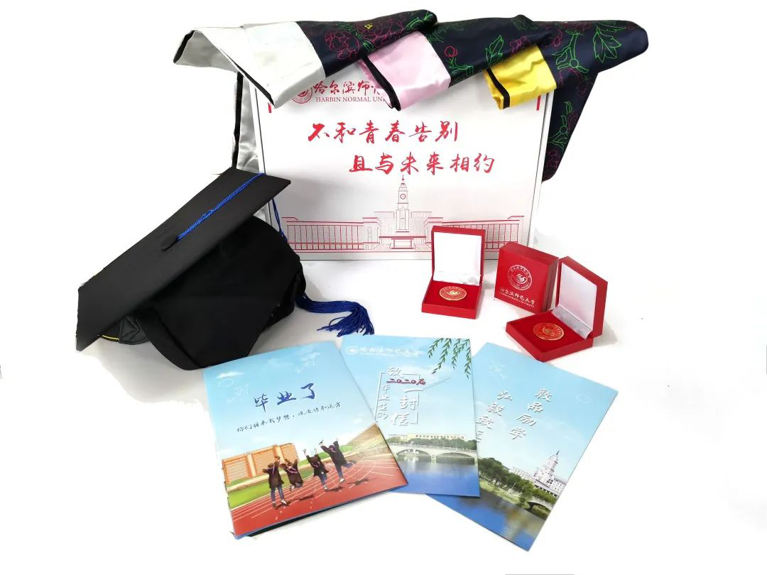 暖暖的礼包,寄出了学校的祝福和牵挂。毕业生因疫情无法返回学校穿学位服、照毕业相、参加毕业典礼,学校专门定制、精心准备了9000余份暖心又珍贵的限量版“毕业大礼包”,免费邮寄给全体毕业生,“毕业季”变成“毕业寄”。礼包内装有一套印有哈师大标识的专属学位服,寓意祝贺同学们四载问学、学有所成,毕业快乐、前程锦绣;一枚师大纪念徽章,希望同学们铭记“敦品励学 弘毅致远”校训精神,传师大精神,做师大名片;一封《致2020届毕业生的一封信》,写满母校的殷殷寄语,祝福2020届毕业生胸怀梦想,追梦的路上再绽芳华。礼包上还印刻着“不和青春告别、且与未来相约”的祝福文字,希望2020届毕业生不负青春韶华,砥砺奋进新时代,每一件礼品都凝结着对毕业生们的祝福与牵挂。