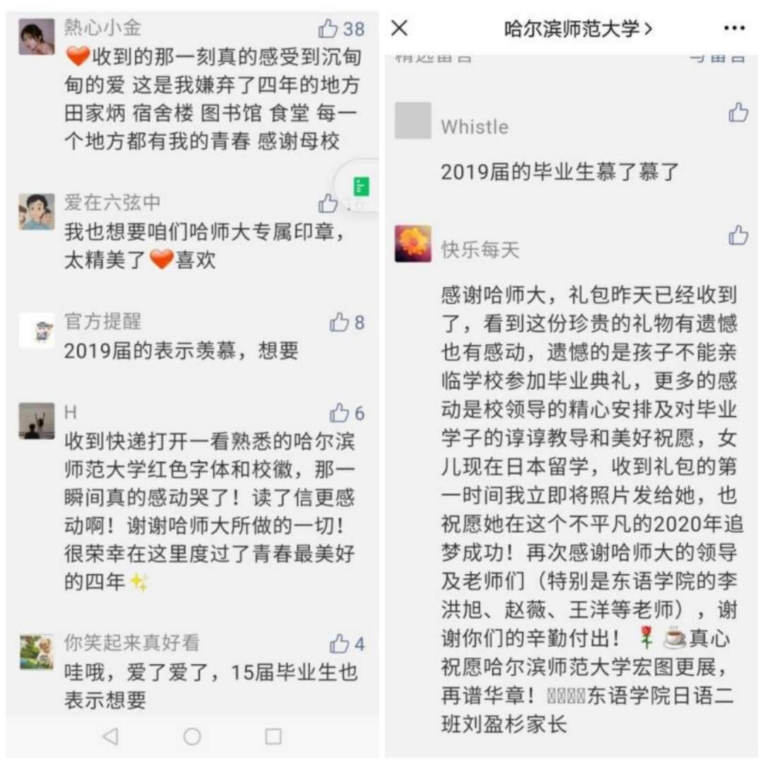 哈师大系列暖心的毕业生工作,收获了毕业生和家长们在微博、微信、抖音等各类媒介平台留下的充满深情厚意的暖心之语。有位毕业生留言说:“以前总觉得时间很慢,慢到可以和你们好好地说再见;现在又觉得时间很快,快到只能匆匆的看一眼!感谢母校,让我们在特殊的毕业季收获了那么多的感动和惊喜,感觉我的大学生活已经圆满了。入了师大门今生都是师大人,我永远爱师大,愿母校越来越好!”