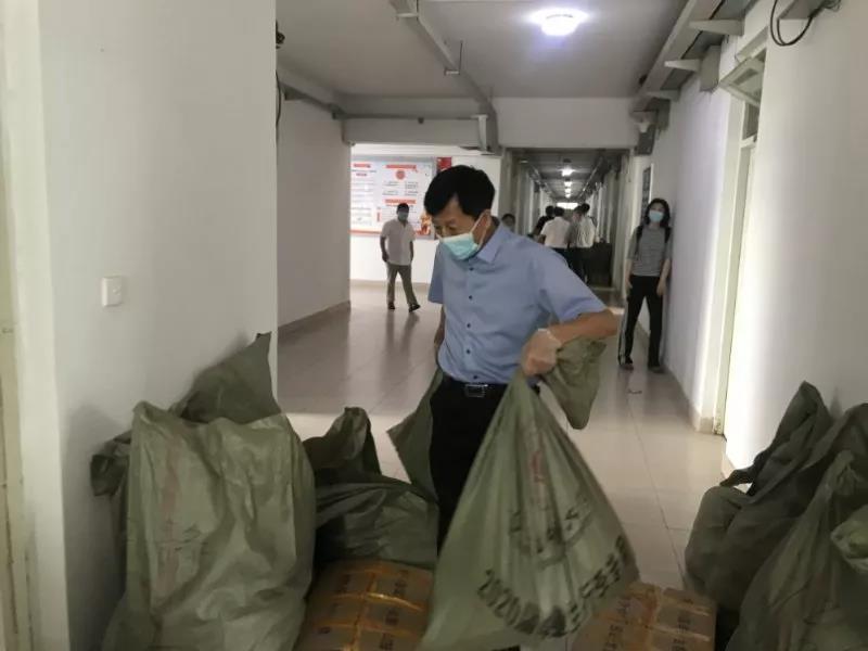 到达学生二公寓后,大家听从化学化工学院老师的指挥,开始为毕业生打包行李,为了能够安全准确地将毕业生存放在学校图书馆的书籍打包邮走,做到让毕业生暖心满意,同志们先是按照人名,将毕业生的书籍送到相应的寝室,将物品集中摆放,确认后再打包邮寄。