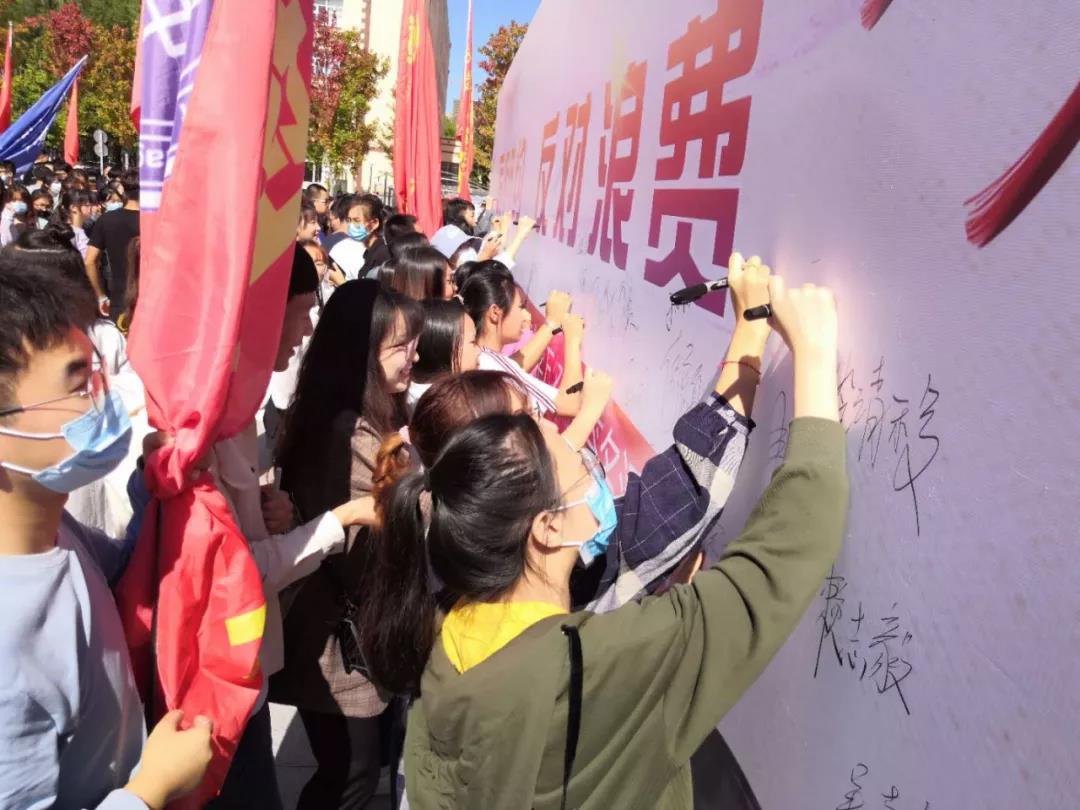 (刘强/文)为深入贯彻落实习近平总书记对制止餐饮浪费行为作出的重要指示精神,弘扬中华民族尊重劳动、珍惜粮食、勤俭节约的传统,9月11日中午,我校在滨湖园前广场举行“厉行节约 反对浪费”师生签名活动。校党委书记,党委副书记郭砾,党委常委、副校长马明出席活动。学校相关部处负责同志、师生代表500余人参加活动。活动由团委副书记毕坤主持。