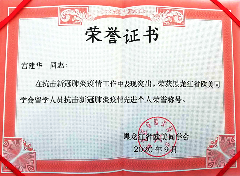 (任凯/文)近日,省欧美同学会为在抗击新冠肺炎疫情斗争中表现突出的先进集体和先进个人颁发荣誉证书,我校分会被省欧美同学会授予“抗击新冠肺炎疫情先进集体”荣誉称号,省文史馆员、省女画家协会主席宫建华教授被授予“抗击新冠肺炎疫情先进个人”荣誉称号。