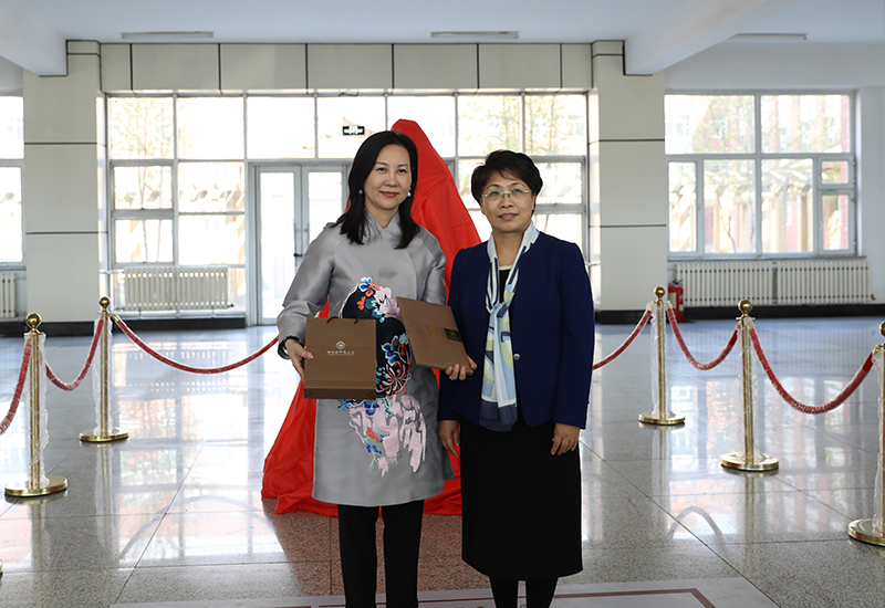 臧淑英代表学校对张莉的到来表示热烈欢迎,并对张莉的爱心举动表示诚挚谢意,为张莉颁发捐赠证书,并回赠纪念品。臧淑英指出,哈师大建校至今,为社会培养了四十多万优秀人才,校友们虽走出校园却始终心怀母校,在母校七十华诞之际,校友们以多种方式向母校表示祝贺,并助力母校发展。母校将牢牢把握时代机遇,不断寻求新的发展,为校友们搭建更广阔的平台,为校友们的发展提供更多更有力的支持。