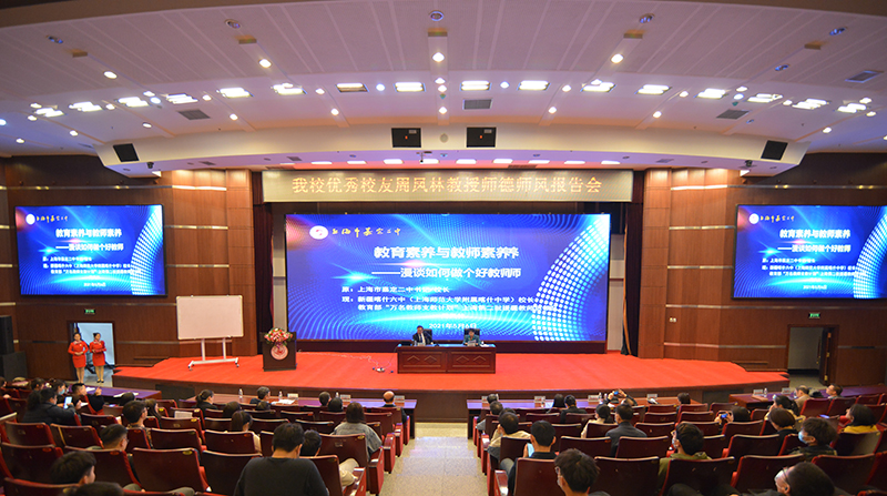 5月6日下午,学校特邀上海市嘉定二中原书记、校长,现新疆喀什第六中学(上海师范大学附属喀什中学)校长、优秀校友周凤林作了题为《教育素养与教师素养》的讲座。校党委书记代表学校党委向周凤林赠送70年校庆纪念册,校长孙立军为周凤林颁发证书,聘请周凤林为我校客座教授。讲座由副校长臧淑英主持。