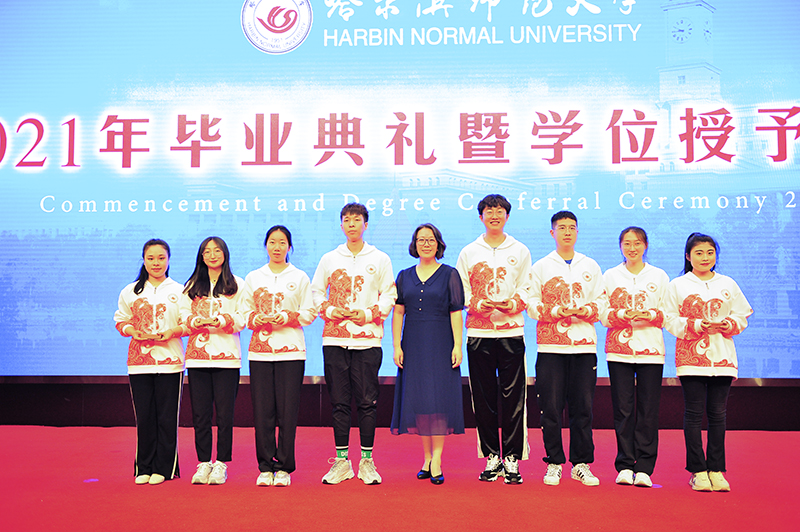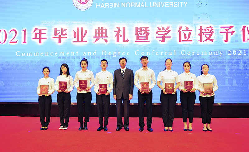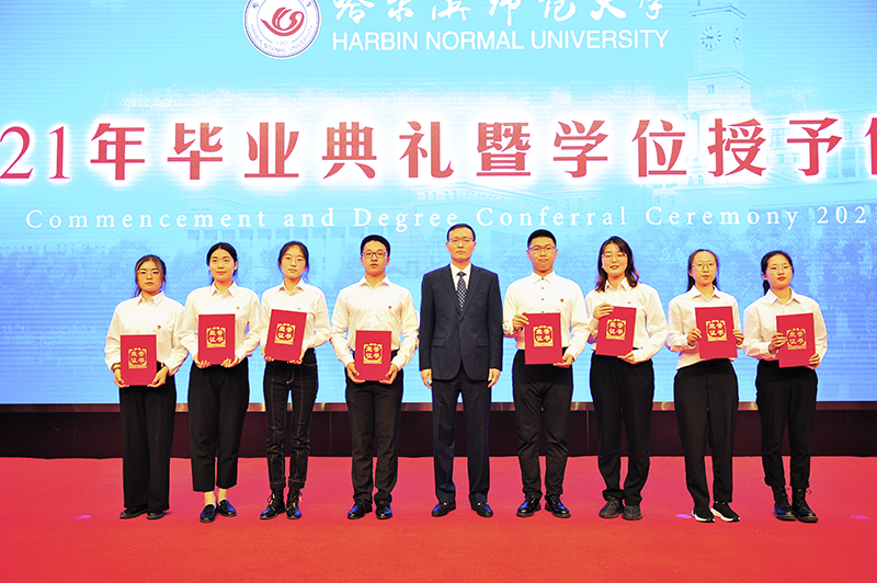 在雄壮的国歌声中,毕业典礼暨学位授予仪式拉开帷幕。校学位评定委员会副主席、副校长、博士研究生导师臧淑英教授宣读了获得博士、硕士、学士学位的2021届毕业生名单和2021届研究生优秀毕业生、本科优秀毕业生名单;校学位评定委员会副主席、党委常委、副校长、博士生导师张喜田教授宣读了“大学生志愿服务西部计划”志愿者名单和选调优秀毕业生到基层工作人员名单;校学位评定委员会成员、党委常委、副校长、博士研究生导师李庆霞教授宣读了“宁齐堃”奖学金、田家炳优秀师范生奖学金获得者名单。
