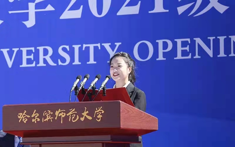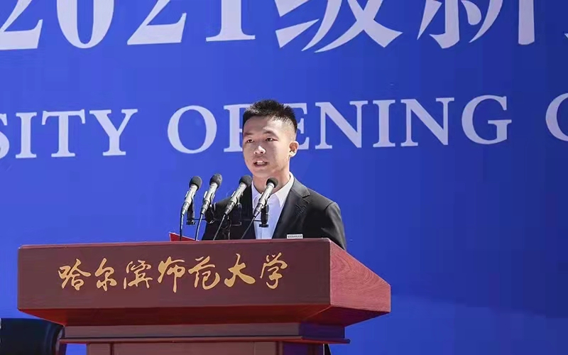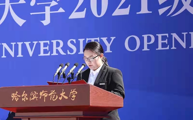 在校学生代表、校学生会主席、经济学院2019级会计学专业许安琦在发言中,以自身经历激励2021级新同学坚持读书、坚持运动、勇于实践。作为“强国一代”,要把大学作为人生中一个新的起点、梦开始的地方。携手并肩,努力拼搏,以舍我其谁的壮志凌云和自强不息的拼搏精神,在哈师大这块热土上创造出属于我们的出彩人生!