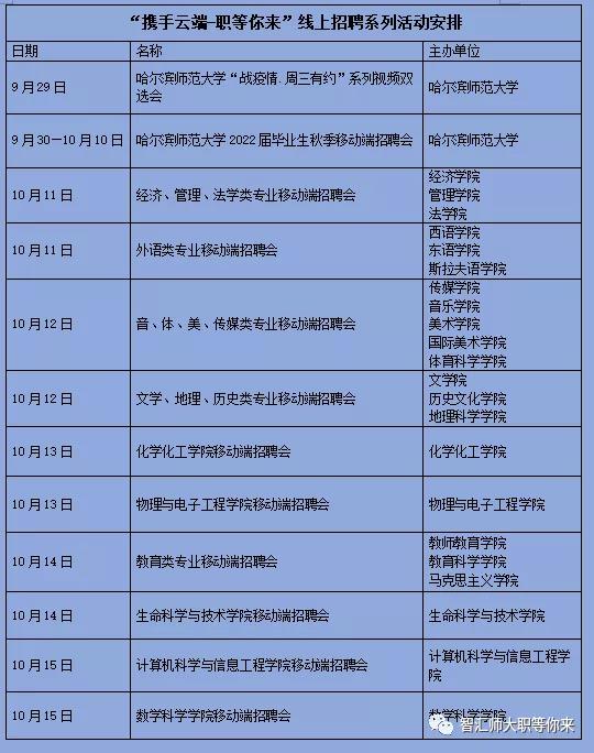 微信搜索关注“哈师大就业指导”公众号,回复“订阅”,点击左下角“招聘汇”,查看“在线招聘”。