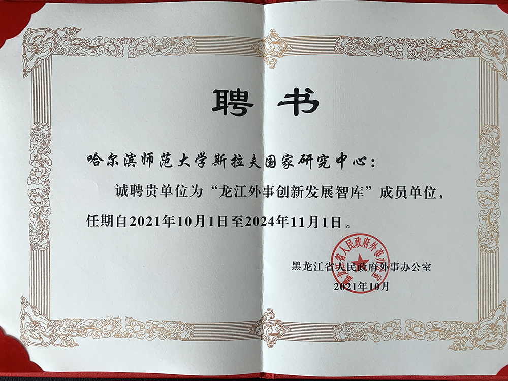 图 教育部国别和区域研究中心“拼搏在线登录斯拉夫国家研究中心”被聘为“龙江外事创新发展智库”成员单位