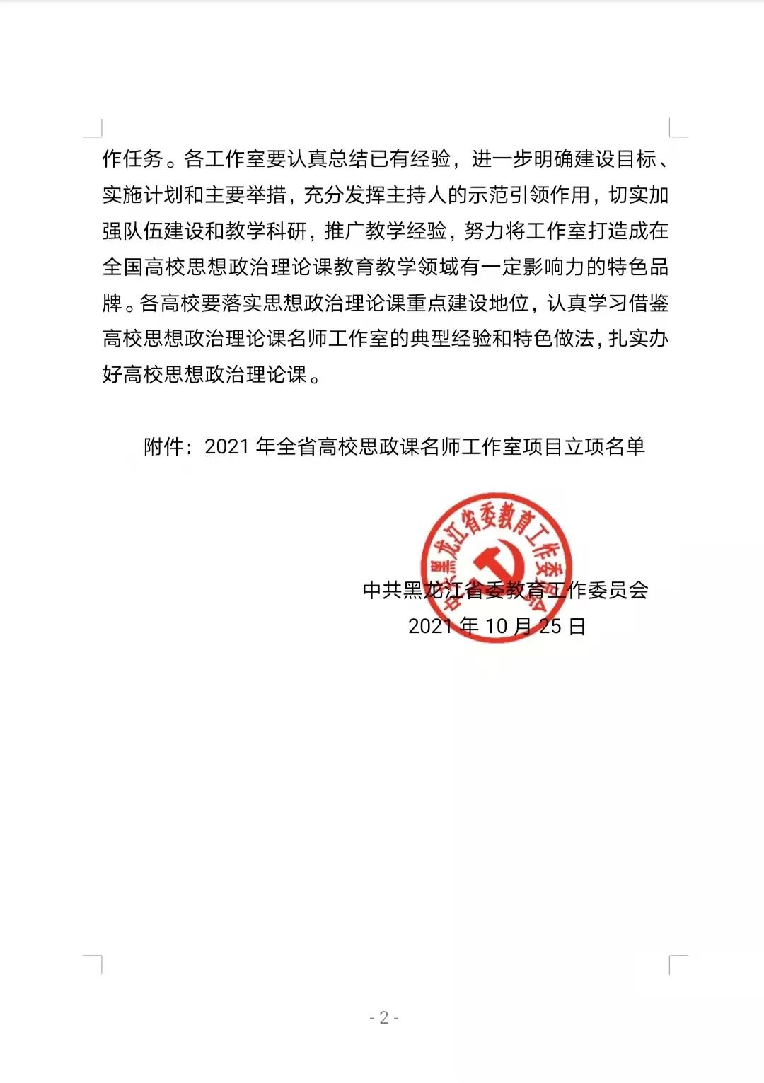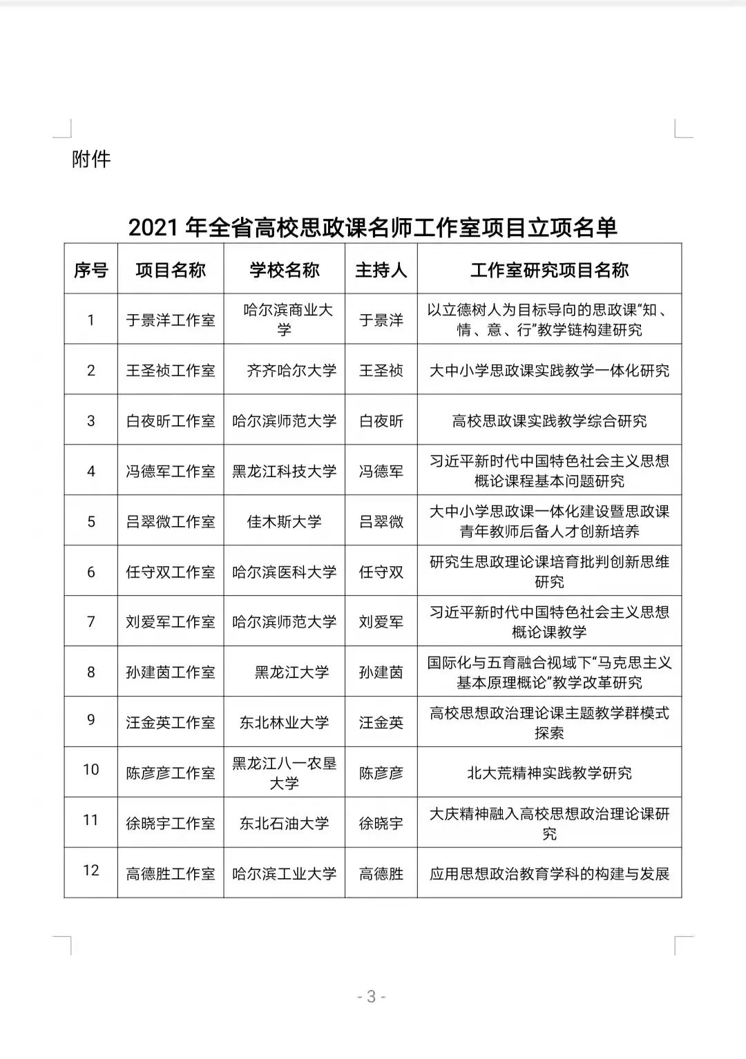 为深化高校思想政治理论课改革创新,进一步加强高校思想政治理论课教师队伍建设,根据省委教育工委《关于组织开展2021年高校思想政治理论课名师工作室遴选工作的通知》(黑教工委函【2021】3号)要求,经学校推荐,经过教育工委组织的专家评审和现场答辩,由马克思主义学院白夜昕教授以《高校思政课实践教学综合研究》为内容申报的白夜昕工作室、刘爱军教授以《习近平新时代中国特色社会主义思想概论课教学》为内容申报的刘爱军工作室获批立项。2个工作立项后,将有力推动我校思政课教学改革和特色品牌树立,为办好思想政治理论课和引领全省思政课建设发挥突出作用。