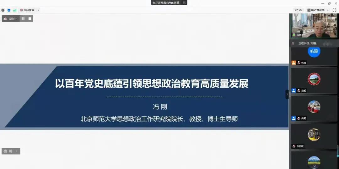 (翟屿潼/文)为深入学习贯彻党的十九届六中全会精神,助力师生进一步学习好、领会好、宣传好、落实好全会精神,推动全会精神精确精准进教材、进课堂、进头脑,12月7日上午,我校马克思主义学院特邀北京师范大学思想政治工作研究院院长、博士生导师冯刚教授作了题为“以党史百年底蕴推动思想政治教育高质量发展”的线上专题讲座。校党委副书记、工会主席郭砾,党委宣传部部长张艳君,马克思主义学院院长段虹、党委书记宋佳东及全体教师、研究生近350人听取了讲座。讲座由段虹教授主持。