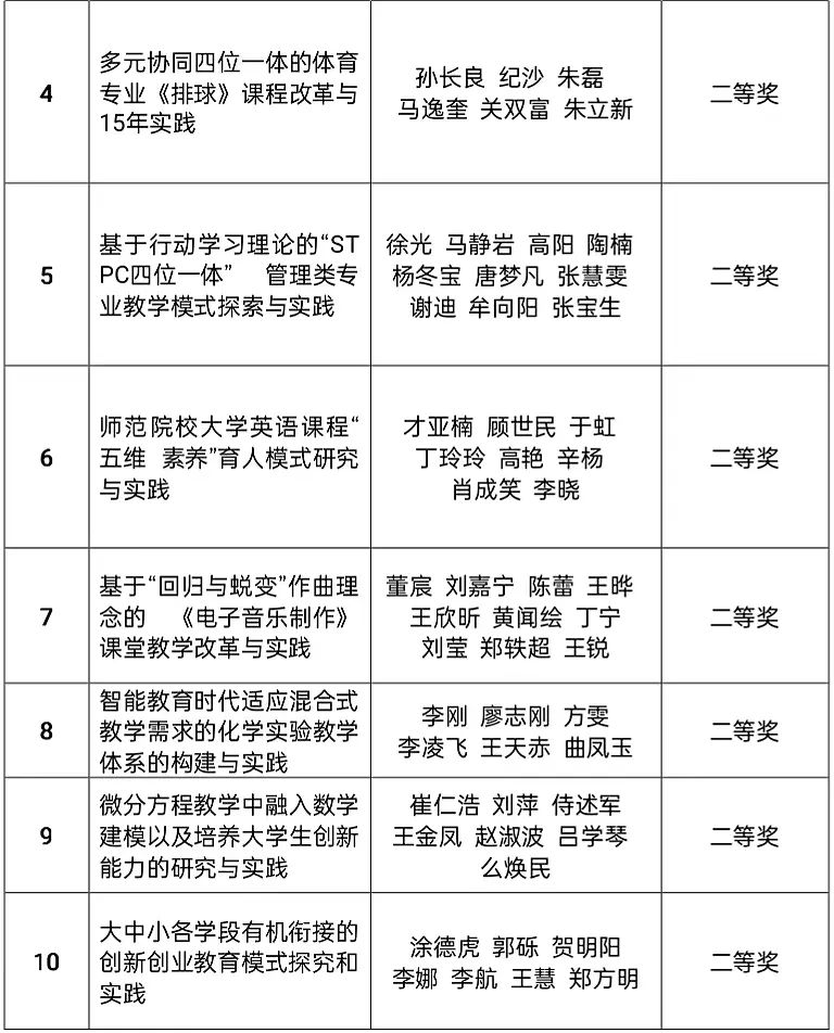 获奖成果是学校长期以来深化教育教学改革,推进内涵建设的结果,是近年来立德树人、教书育人和教学改革等方面特色与成效的具体体现,表明我校在专业建设、课程建设等人才培养核心环节取得了新突破、新进展,展示了学校坚持以人才培养为中心,扎实推进教育教学改革取得的新成效。希望获奖成果团队珍惜荣誉、再接再厉,继续巩固和完善获奖成果,在教育教学改革、研究和实践中充分发挥示范引领作用,加快教学成果获奖的经验推广,鼓励广大教师潜心教育教学研究,鼓励和引导广大教师深入开展教学改革与实践,展示教书育人成果,不断提升人才培养质量;提升我校一流本科专业建设、一流本科课程建设,推动学校本科教学高质量发展。