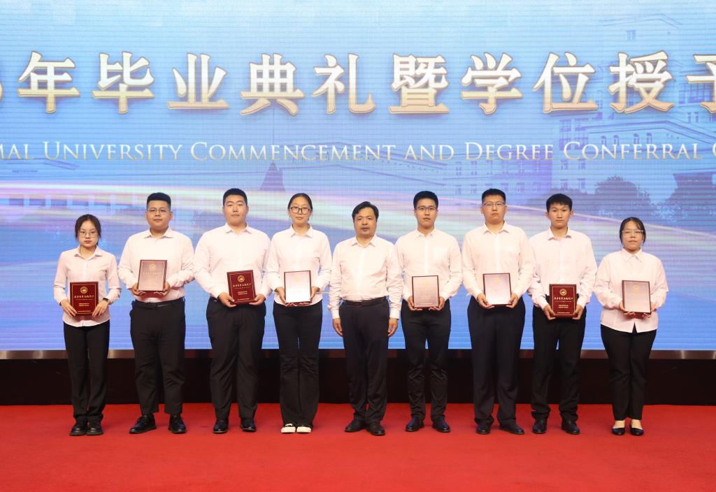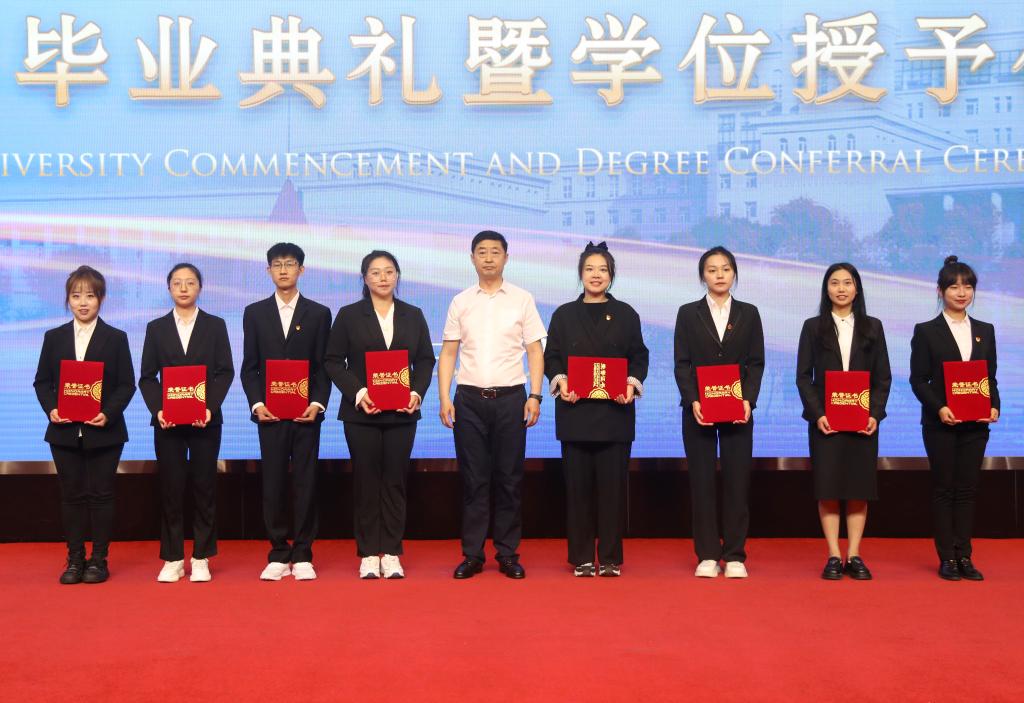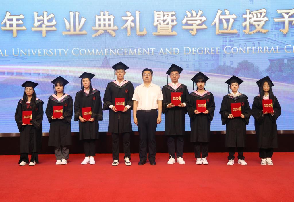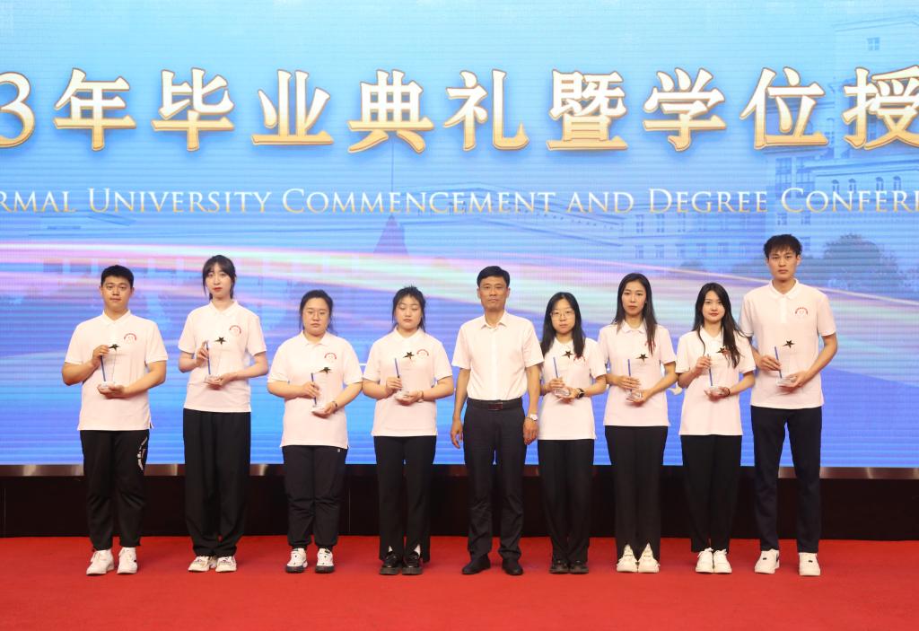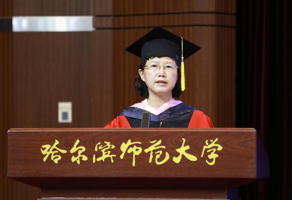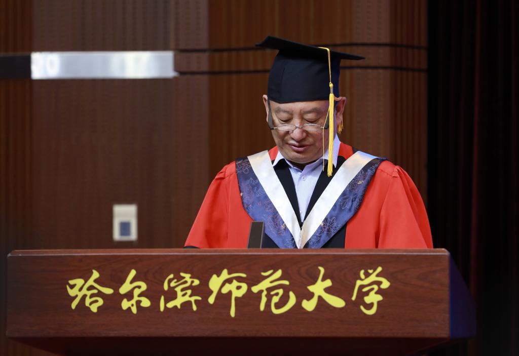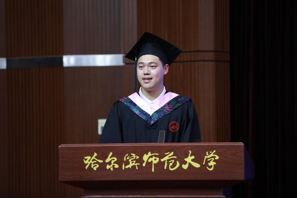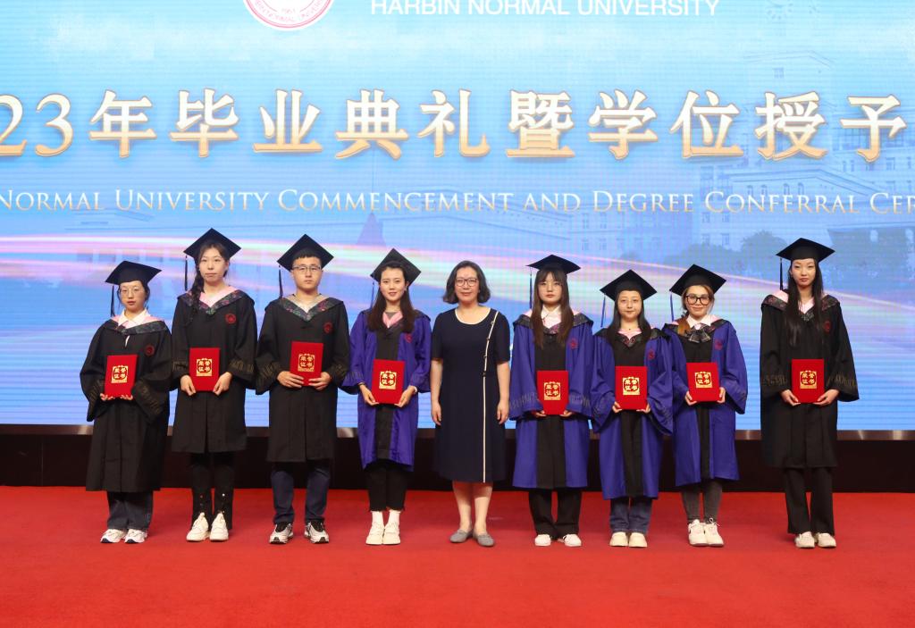 在校生代表、第二十二届校学生会执行主席、地理科学学院2020级本科生兰品宽表达了对学长的不舍与祝福。表示在校生将以学长们为榜样,勤于学习,善于思考,勇于实践,敢于创新,为把母校建设成为国内一流师范大学贡献青春力量。教师代表、第六届黑龙江省高校青年教师教学竞赛文科组一等奖获得者、西语学院副教授于慧莹在发言中深情寄语毕业生,昨天同学们是这里的莘莘学子,明天就要承载起母校的厚望,披荆斩棘,追逐梦想,希望大家在奋斗之时,还能享受人生,保重身体。希望同学们常回母校看看,老师们在哈师大很想你!校友代表、拼搏在线登录附属中学校长、国家苏步青奖获得者、中国数学会数学教育分会常务理事、中国数学奥林匹克高级教练员、我校数学系数学教育专业1993届毕业生刘振成分享了自己的成长经历、从事育人工作后的奋斗历程,以及围绕忠心、苦心、诚心、凡心讲述自己的育人感悟。他鼓励同学们,希望大家充满自信,奔向属于自己的未来。伴随着欢快而喜庆的乐曲,党委副书记、工会主席郭砾为2023届优秀毕业生代表颁发荣誉证书;党委常委、副校长尹剑锋为2023年选调应届优秀毕业生到基层工作人员代表颁发纪念奖牌;党委常委、副校长王辉为2023年“大学生志愿服务西部计划”志愿者代表颁发纪念奖杯;党委常委、副校长徐国峰为2023年“助力兴边富民计划”志愿者代表颁发纪念奖杯;党委常委、人事处处长李世彬为2023年“宁齐堃”奖学金获奖代表颁发证书;党委常委、统战部部长张志宏为2023年“田家炳优秀师范生”奖学金获奖代表颁发证书。随后,学校第十一届学位评定委员会主席孙立军教授,学位评定委员会副主席张喜田教授,学位评定委员会委员李庆霞教授、李岗教授、李林教授、徐光教授、孙长良教授,为获得博士、硕士、学士学位的毕业生代表授予学位、拨流苏,为毕业学子送上最深切的祝福。全场报以热烈的掌声。马明在总结时指出,一朝师大人,一生师大情!母校永远是同学们的温暖港湾、永远是同学们的坚强后盾、永远是同学们的精神家园!同学们也永远是母校和老师们的牵挂。欢迎同学们常回家看看!最后,现场师生齐声高唱《拼搏在线登录校歌》,2023年毕业典礼暨学位授予仪式在歌声中落下帷幕。