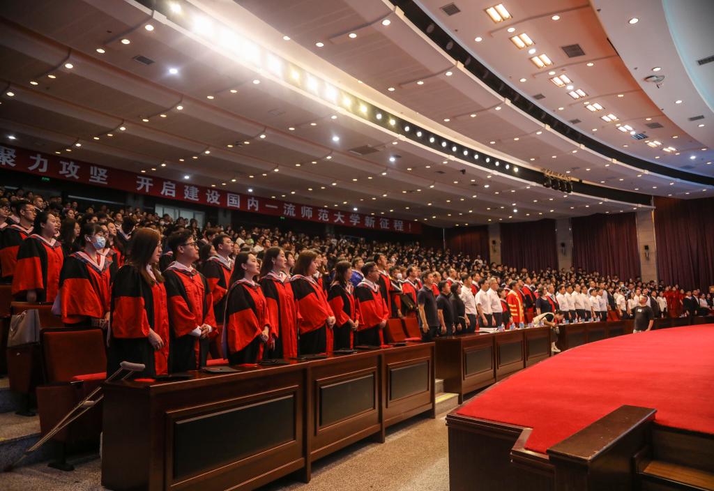 孙立军回顾了2023届毕业生在校学习生活的点点滴滴,细数了师大学子在各个领域取得的傲人成绩。在建设“国内一流师范大学”的征途上,师大学子与母校一起,以奋进之笔书写了“强国建设、教育何为”的师大答卷;面对严峻复杂的疫情形势,师大学子始终与学校同舟共济,以实际行动彰显了新时代师大人的责任与担当;在砥砺前行的求学路上,师大学子始终保持昂扬向上的奋斗姿态,以优异表现彰显了新时代师大人的自强不息。孙立军深情寄语全体毕业生,希望同学们厚植家国情怀,在报国奉献中实现人生追求。牢记“请党放心,强国有我”的青春誓言,胸怀“国之大者”,勇担时代使命,以天下为己任,融入“大我”,成就“小我”,让青春在祖国和人民最需要的地方绽放绚丽之花。希望同学们涵养进取品格,在追求真知中开启美好未来。坚持志不求易、事不避难,迎难而上、知难而进,把学习和研究作为人生的常态,以积极的心态应对各类新鲜事物,以创造性的学习越高山跨峻岭,在持续创新中追逐梦想,在积极进取中升华人生。希望同学们保持奋斗姿态,在实干笃行中成就人生精彩。为理想、梦想而努力拼搏,在新时代广阔舞台上建功立业,在服务社会、奉献国家的奋斗历程中书写人生华章。最后,孙立军期待广大毕业生继续秉承“敦品励学、弘毅致远”的校训精神,继续弘扬“无私奉献、知行合一、务实进取、教育为公”的“行知精神”,踔厉奋发,勇毅前行,矢志奋斗、永久奋斗,在追逐人生梦想的赛道上不断超越自我、奋勇争先,在全面建设社会主义现代化强国的伟大实践中,建功立业、再创辉煌!
