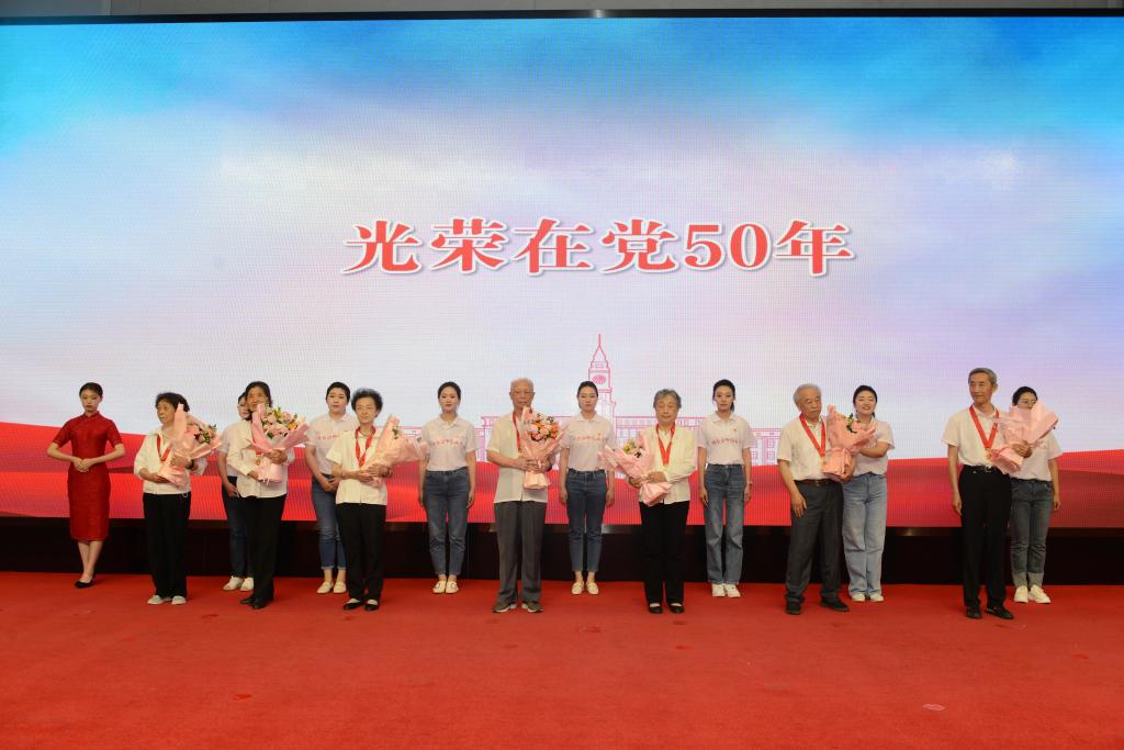 孙立军为中共中央“光荣在党五十年”纪念章获得者代表佩戴了纪念章,7位老党员激动地说:“离岗不离党、退休不褪色”“坚定信念 践行宗旨 为党的教育事业奋斗终生”“光荣在党五十年,初心不改勇向前,为实现中国梦奋斗终生!”……简短有力的语言,让现场响起经久不息的掌声。他们平均党龄51年,平均年龄75岁,正是这样一批吃苦耐劳有高尚品格、公而忘私奉献精神的党员,在学校发展历史上作出了卓越贡献,用实际行动展示了哈师大人的初心和使命,用时间和岁月见证了历史的发展和成长,他们的示范作用和榜样的力量感染着每一位共产党员。7名青年教师党员为老党员献花,全场党员干部用热烈的掌声向他们致敬,感谢这些老党员为学校的发展建设作出的卓越贡献。