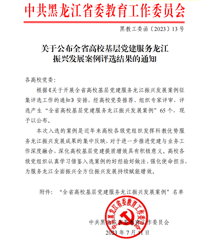 我校基层党建“1527”质量提升工程再创佳绩——3个案例成功入选全省高校基层党建服务龙江振兴发展案例