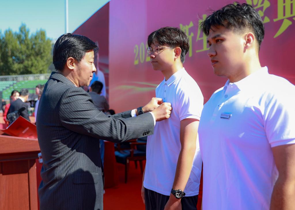 学校领导孙立军、蒋鲲、郭砾、李庆霞、臧淑英、马明、张喜田、尹剑锋、王辉、徐国峰、李世彬、张志宏出席活动现场。学校相关部门主要负责人、各学院党政领导和全体2023级新生辅导员等参加典礼。党委副书记、工会主席郭砾主持典礼。