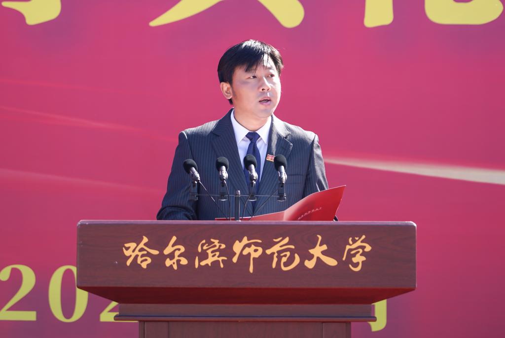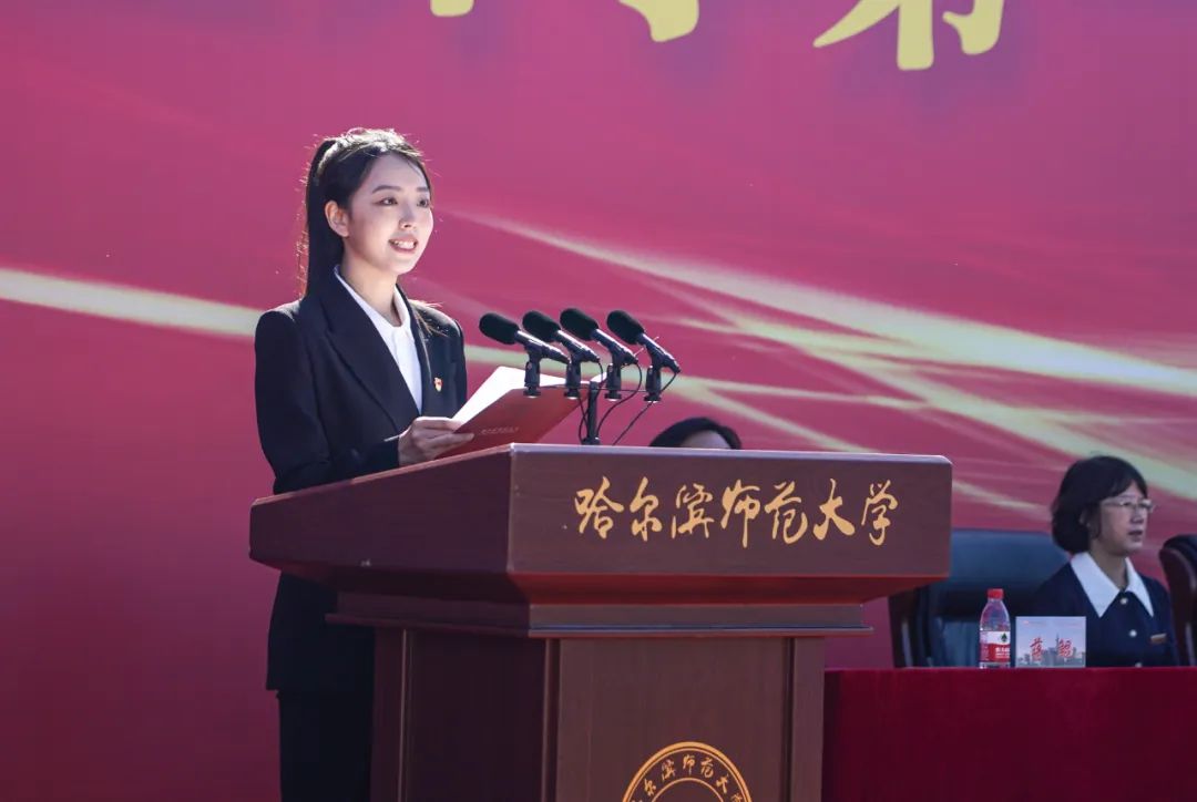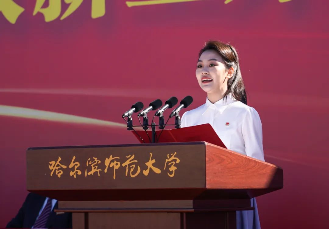 在校学生代表、校研究生会执行主席、经济与管理学院2022级研究生洪溪悦在发言中勉励学弟学妹们要不忘赤诚初心,练就过硬本领,保持旺盛的探索能力,做追梦筑梦、勇于担当的哈师大青年,唱响青春之歌,用奋斗书写无愧于心、无愧于时代的青春篇章。