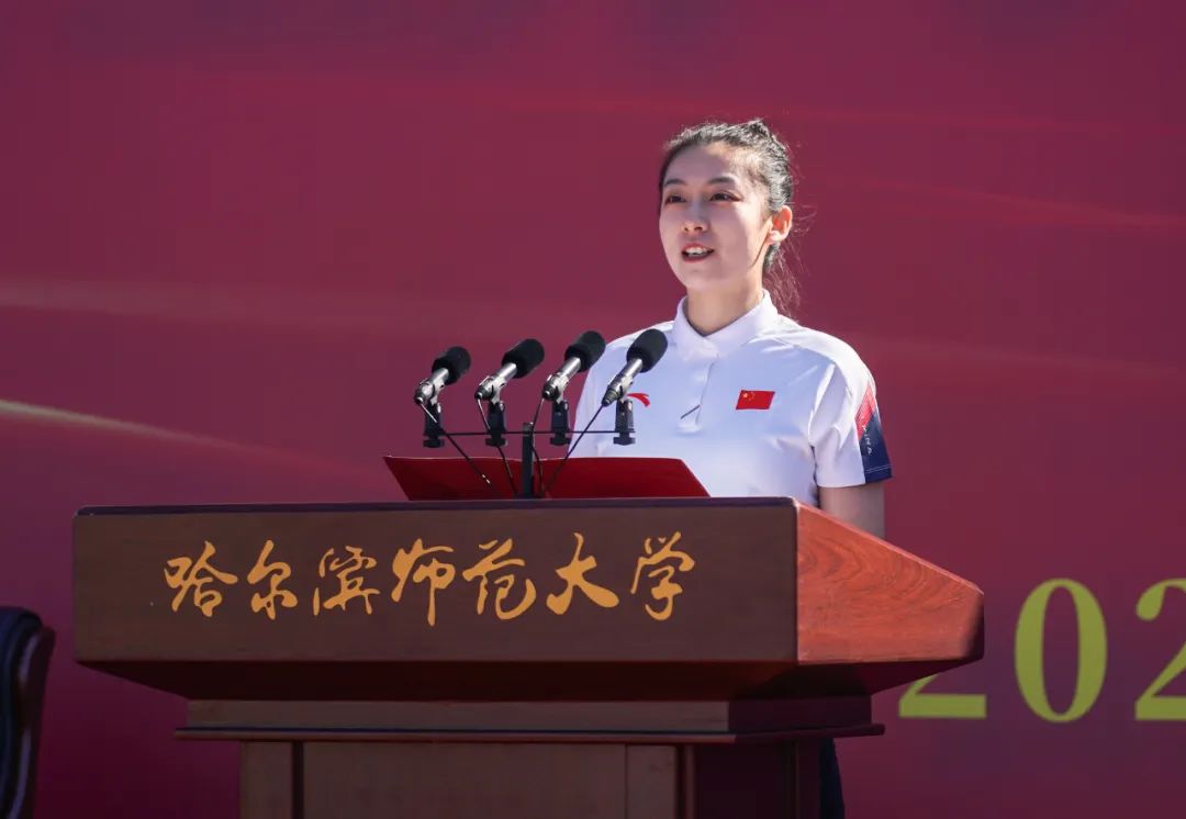 研究生新生代表、曾两次荣获全国大学生健身操舞锦标赛一等奖的体育科学学院社会体育指导专业2023级研究生王迪在发言中表态,以“哈师大人”的身份站在这里的每一个“萌新”,在人生新的篇章中,都将立足专业,厚积薄发,强健体魄,奋力拼搏,期待光荣地接过时代的接力棒,成为奋进征程中的“领跑者”。