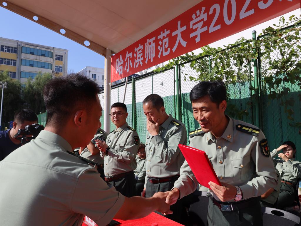 分列式结束后,军训师副参谋长、校长办公室主任赵士兵,军训师政治部主任、教务处处长姜洪泉分别宣读了军训师关于江北校区的表彰决定和军训师关于江南校区的表彰决定。与会领导为军训期间表现突出、成绩优异的个人及集体颁发获奖证书和奖牌。