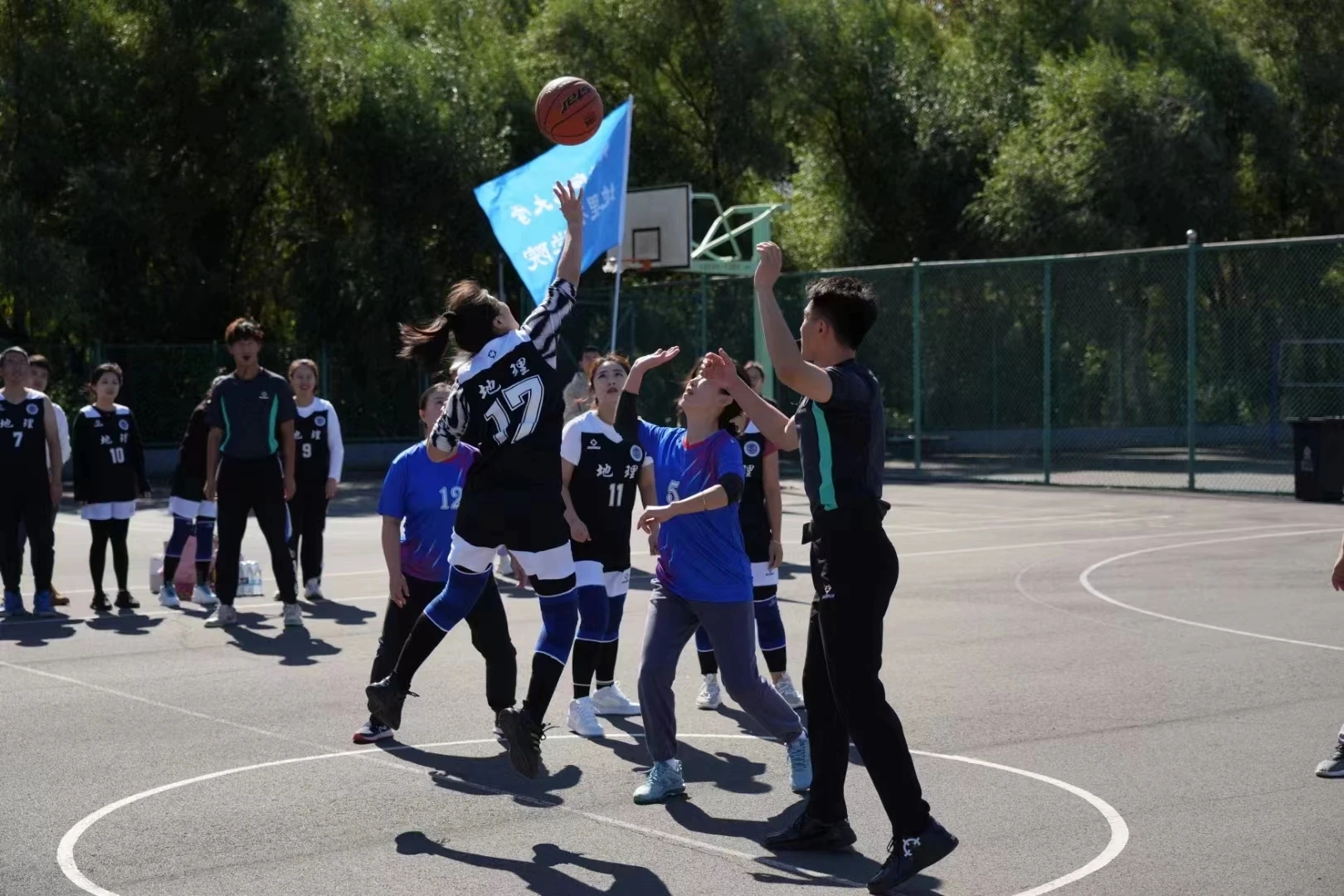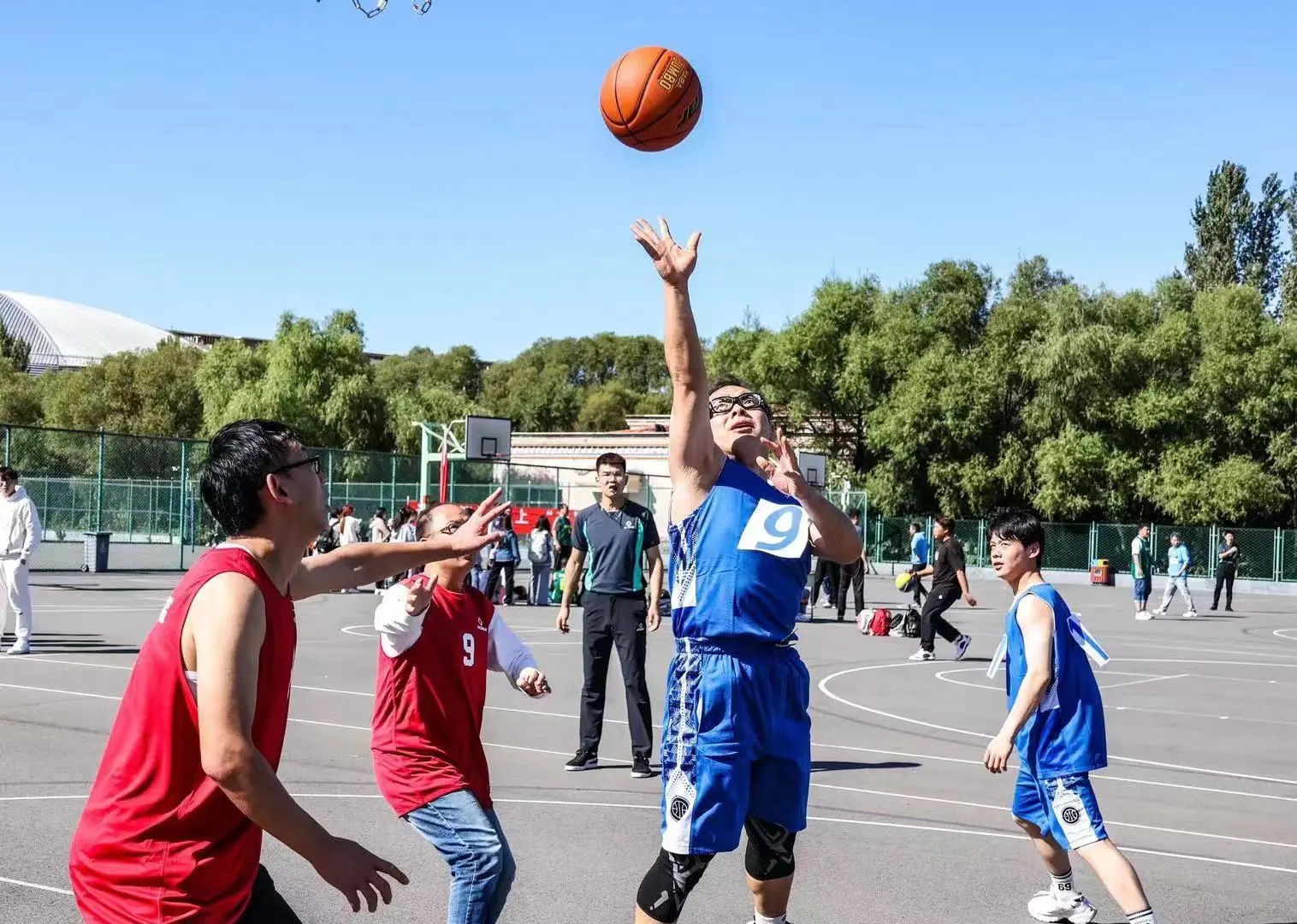 蒋鲲等学校领导为首场比赛开球,拼搏在线登录2023年教职工篮球赛正式拉开序幕!