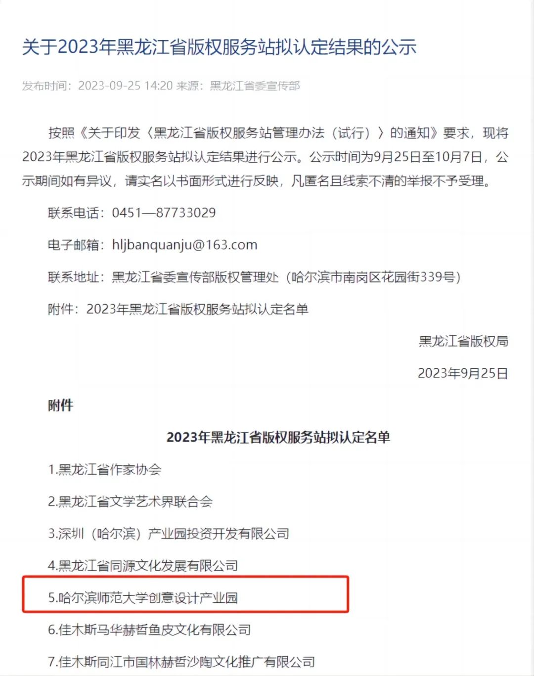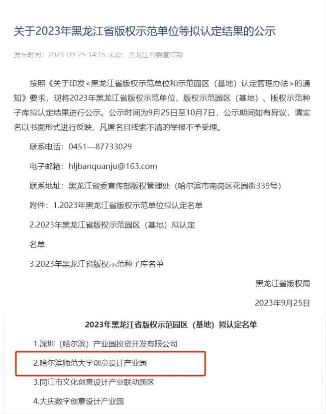 近日,黑龙江省委宣传部版权管理处发布了关于2023年黑龙江省版权示范单位、版权示范园区(基地)、版权示范种子库及黑龙江省版权服务站拟认定结果的公示。