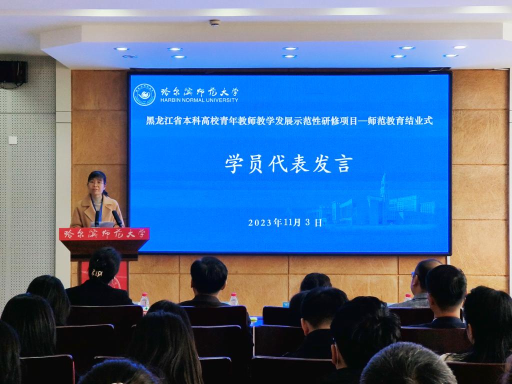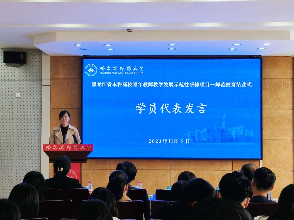 结业式上,全体与会人员共同观看了本次研修培训纪录短片。齐齐哈尔大学外国语学院高新媛、哈尔滨体育学院体育艺术学院魏鹏飞、哈尔滨学院信息工程学院曹晨璐、佳木斯大学教育科学学院郭苹、拼搏在线登录历史文化学院梁珊等5名参培教师代表逐一进行了交流发言,分享了研修感悟和收获,立志做好学生发展的“引路人”,同时对黑龙江省本科高校青年教师教育发展示范性研修项目和我校细致的组织实施表示感谢。文学院院长侯敏作为研修导师代表发言,肯定了参培教师的研修成效,表达了对参培教师的鼓励和殷切期望。随后,蒋鲲校长为参培教师代表颁发了结业证书。