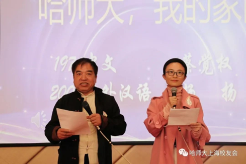 现场,校友们相互问候、亲切交流,共同追忆在哈师大求学时期的美好经历。年会设置了精彩的表演、游戏和抽奖环节,热烈的气氛一浪高过一浪。2004级学前教育校友张美娜的歌曲《长大后我就成了你》让校友们重温了为师的初心和使命;由1976级中文校友蔡觉权和2008级对外汉语杨扬朗诵诗歌《哈师大,我的家园》让校友们热泪盈眶;2001级声乐张磊校友的一首咏叹调,彰显了哈师大毕业生在声乐领域的高度,商会会员宋邦春代表上海哈商会献唱《人在旅途》让校友们感受了在外打拼人的不易;年会在全体校友大合唱《年轻的朋友来相会&二十年后再相会》的悠扬歌声中圆满结束。