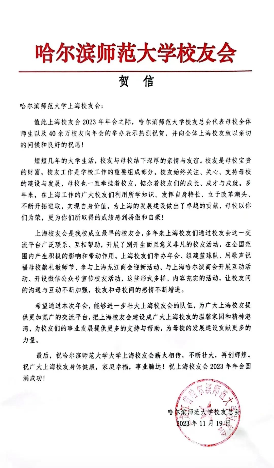 校友总会为上海校友会发送了贺信,对年会的召开表示热烈祝贺,并祝福校友们事业腾达、万事顺意。