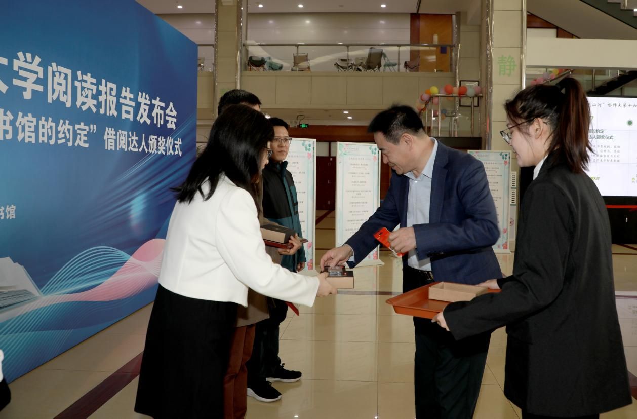 活动伊始,乔峰对第29个“世界读书日”进行了介绍,并宣读了荣获2023年度“我与图书馆的约定——借阅达人”称号的教师与学生名单。图书馆馆长杨革发布了《拼搏在线登录2023年度阅读报告》。马明为获奖的教师、学生代表颁发荣誉证书和奖品,经济与管理学院教师谢迪作为借阅达人代表发言。