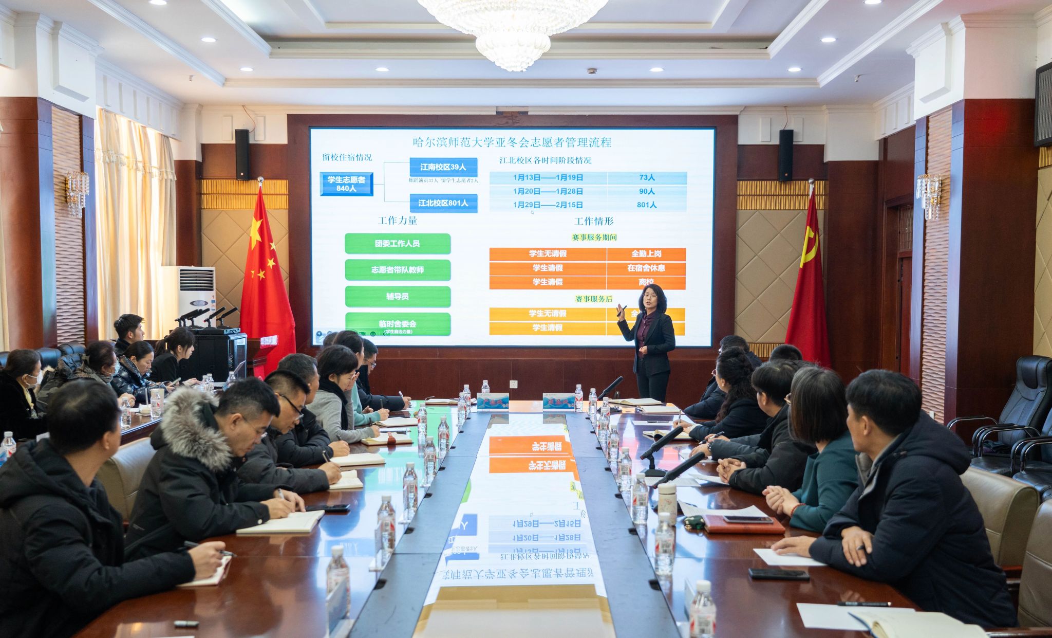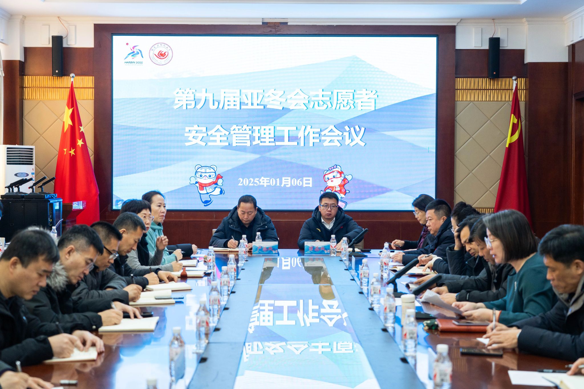为贯彻落实全省服务保障亚冬会工作会议精神,切实做好我校亚冬会志愿者在校及赛会服务期间安全管理工作,全领域、全时段、立体化推进志愿者精细化管理,压实安全管理责任,1月6日上午,学校在行知楼0107会议室召开第九届亚冬会志愿者安全管理工作会议。校长蒋鲲出席会议并讲话,党委副书记、工会主席郭砾,党委常委、副校长尹剑锋,党委常委、副校长徐国峰,党委常委、宣传部(党委教师工作部)部长张艳君,学校党委办公室、校长办公室、学生工作部(学生处、武装部)、团委、教务处、保卫处、后勤管理处、产业处、国际教育学院主要负责同志,各学院党委副书记,全体亚冬会志愿者教师参加会议。会议由郭砾主持。