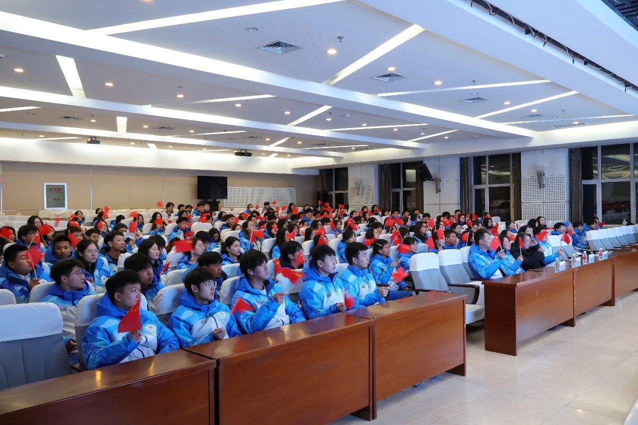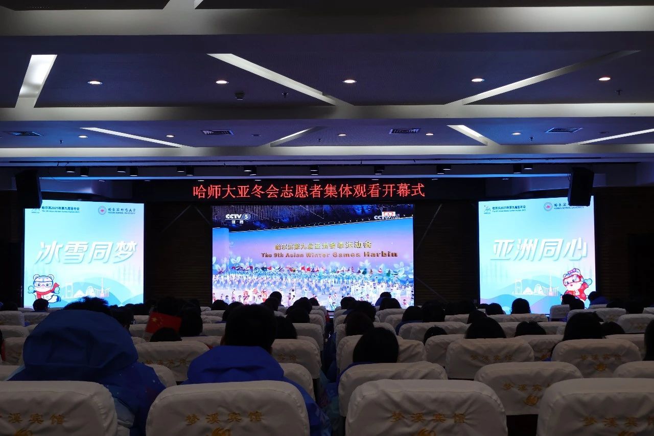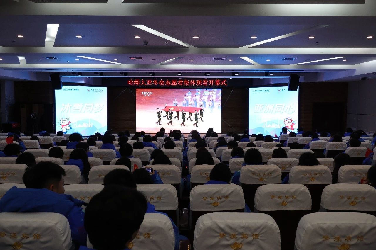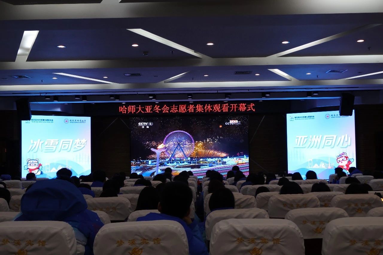 校党委副书记、工会主席郭砾,学校团委相关负责同志,我校亚冬会志愿者代表200余人在培训中心二楼集中观看了哈尔滨2025年亚冬会开幕式直播。