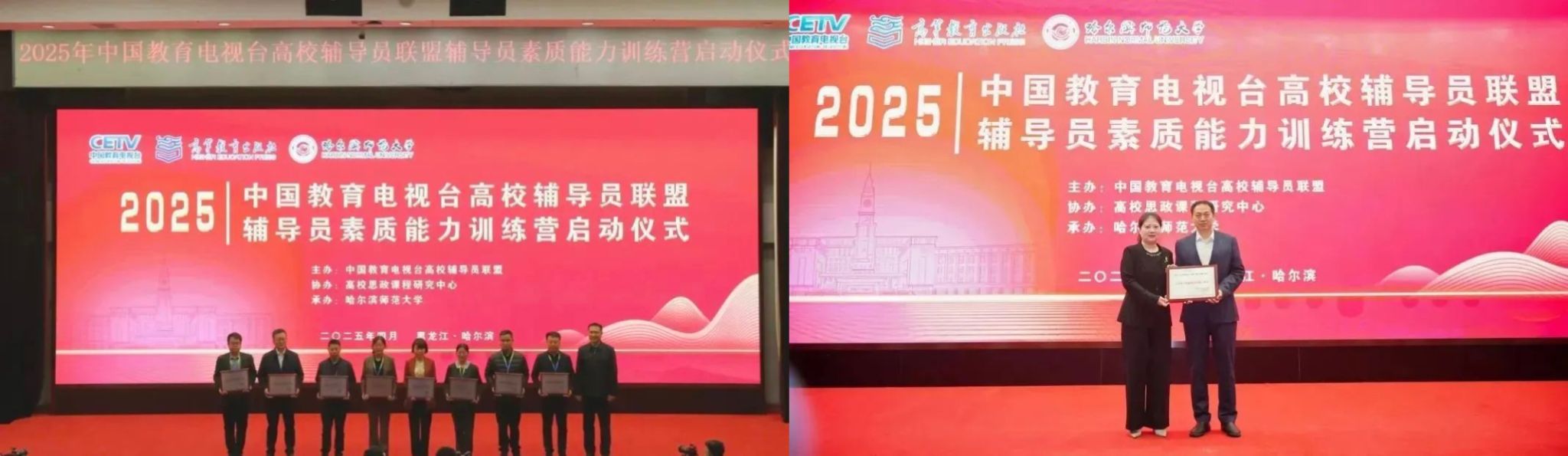 启动仪式上,中国教育电视台副台长周飞,为渤海大学、北华大学、成都医学院等新加入联盟的17所高校授牌。中国教育电视台团委书记、科教思政中心副主任王双为我校“敬国”辅导员名师工作室授牌“联盟”乡村振兴工作室。