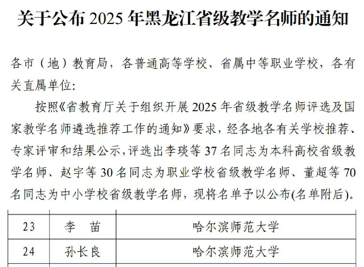 近日,黑龙江省教育厅发布了《关于公布2025 年黑龙江省级教学名师的通知》(黑教发[2025]31号),我校地理科学学院教授李苗、体育科学学院教授孙长良喜获2025年黑龙江省教学名师奖。