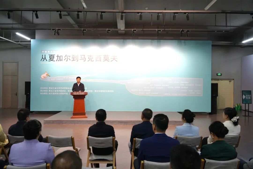 黑龙江省文学艺术界联合会党组书记马新宣布展览开幕。我校党委常委、副校长徐国峰,中国美术家协会水彩艺委会主任、黑龙江省文学艺术界联合会副主席、黑龙江省美术家协会主席赵云龙,我校国际美术学院院长牟克,黑河市瑷珲历史陈列馆馆长孟晓丹先后致辞。我校教务处、高教研究与教学质量评估中心等相关部门负责人以及高校相关专业师生、艺术家等200余人参加开幕式。我校国际美术学院党委书记李卓主持。