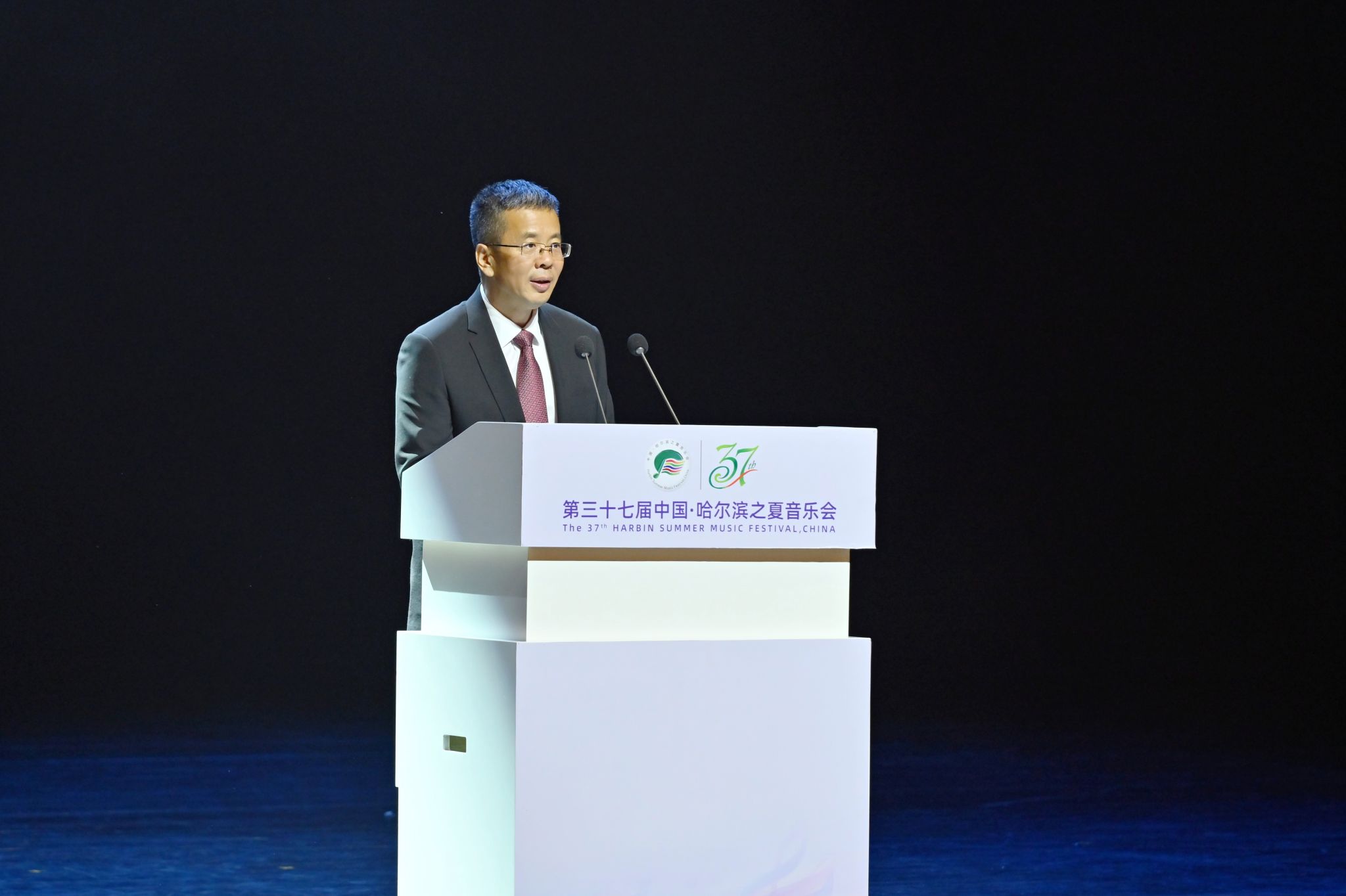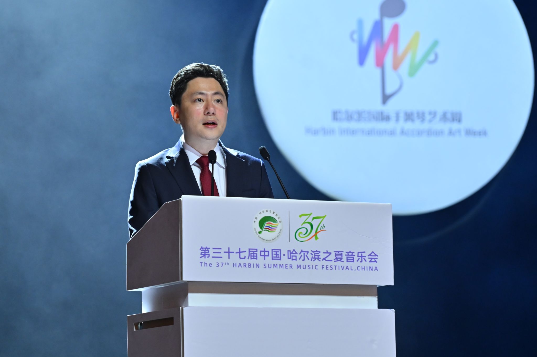 王波在致辞中指出,手风琴艺术在哈尔滨有着广泛的群众基础和深厚的发展土壤,演奏手风琴已成为市民音乐生活中独具特色的一部分。哈尔滨国际手风琴艺术周已连续六次亮相“哈夏”音乐会舞台,成为广大手风琴爱好者和艺术家热切期盼的重要盛会。他表示,手风琴艺术周要坚持守正创新、融合开放,着力打造高水平、国际化、专业性的艺术交流平台。